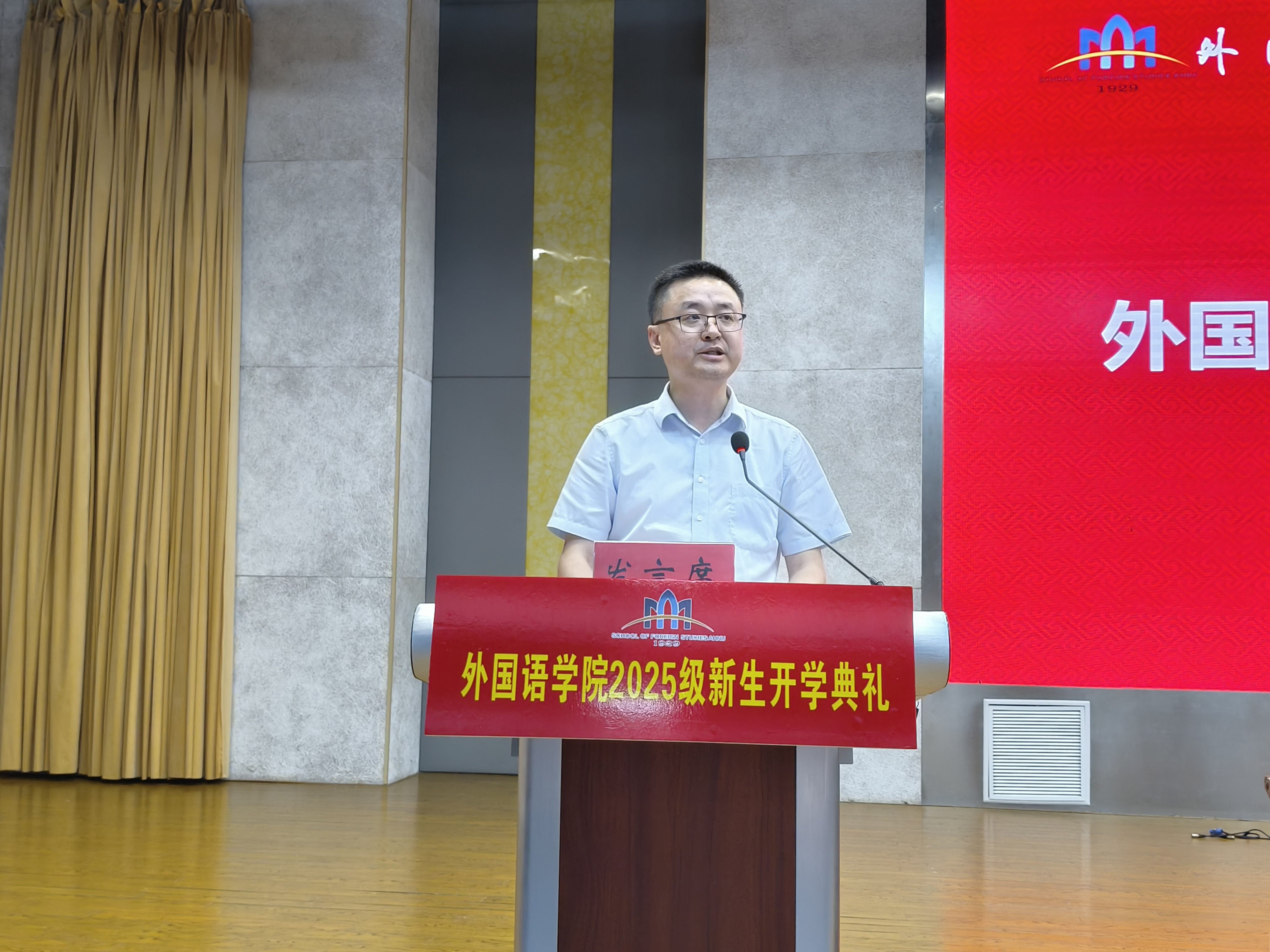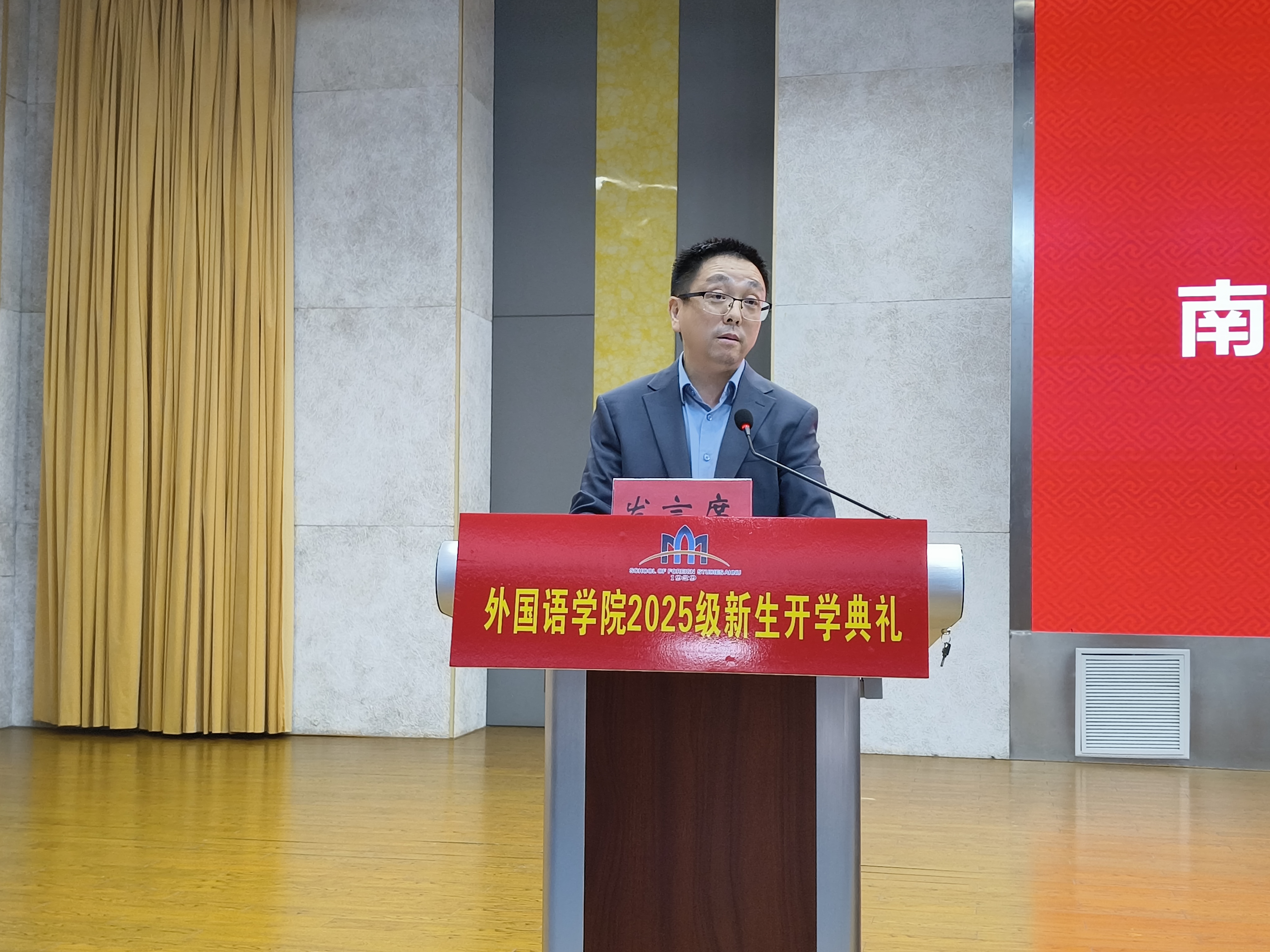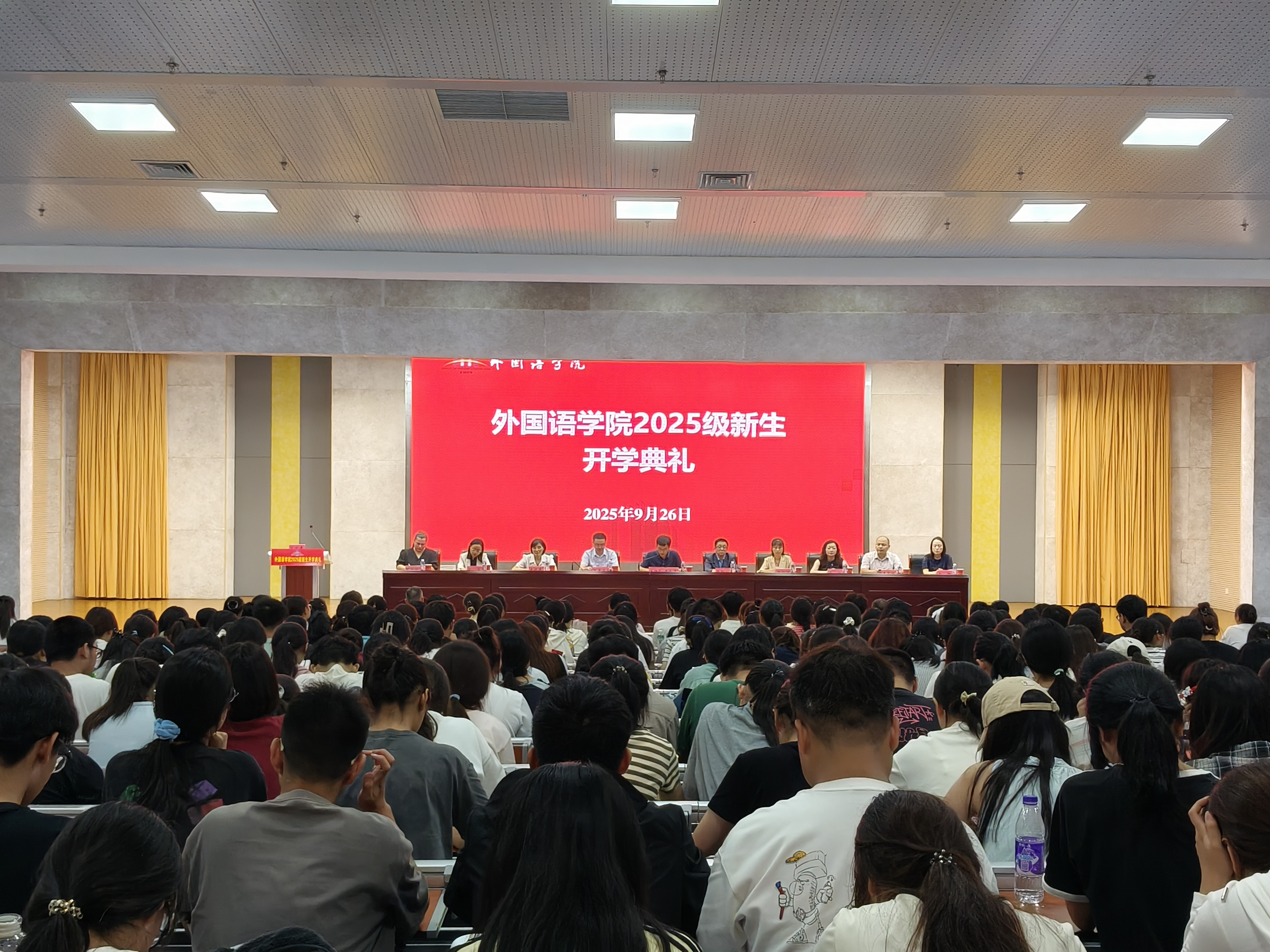 9月26日晚,外国语学院2025级新生开学典礼在理科实训大楼报告厅举行。英语系2001届校友、南京师范大学外国语学院副院长张智义教授,学院党政领导,各专业负责人,学位点负责人,外籍教师和辅导员,以及2025级全体本科生、研究生参加开学典礼。典礼由学院党委书记戴和圣主持。