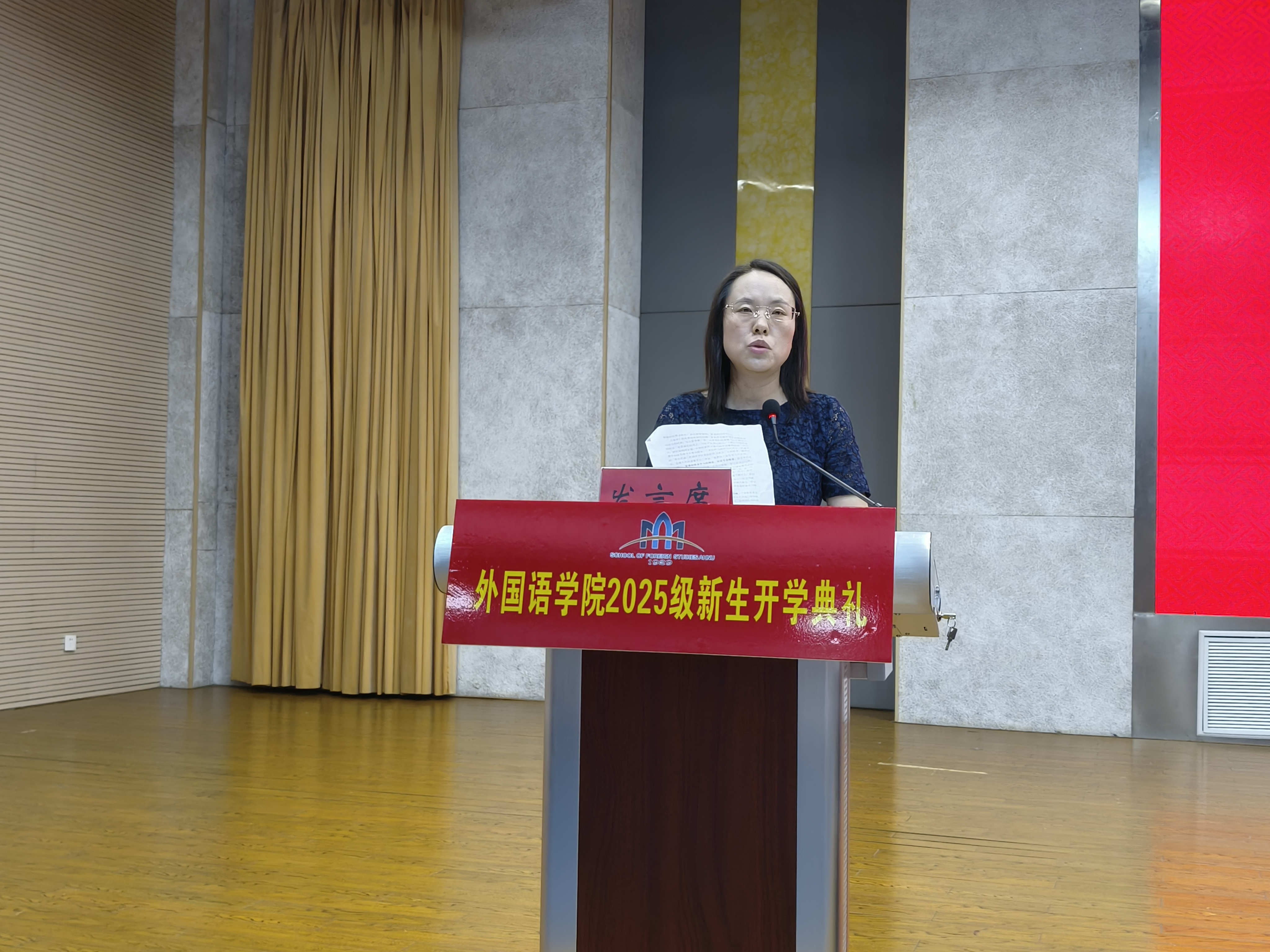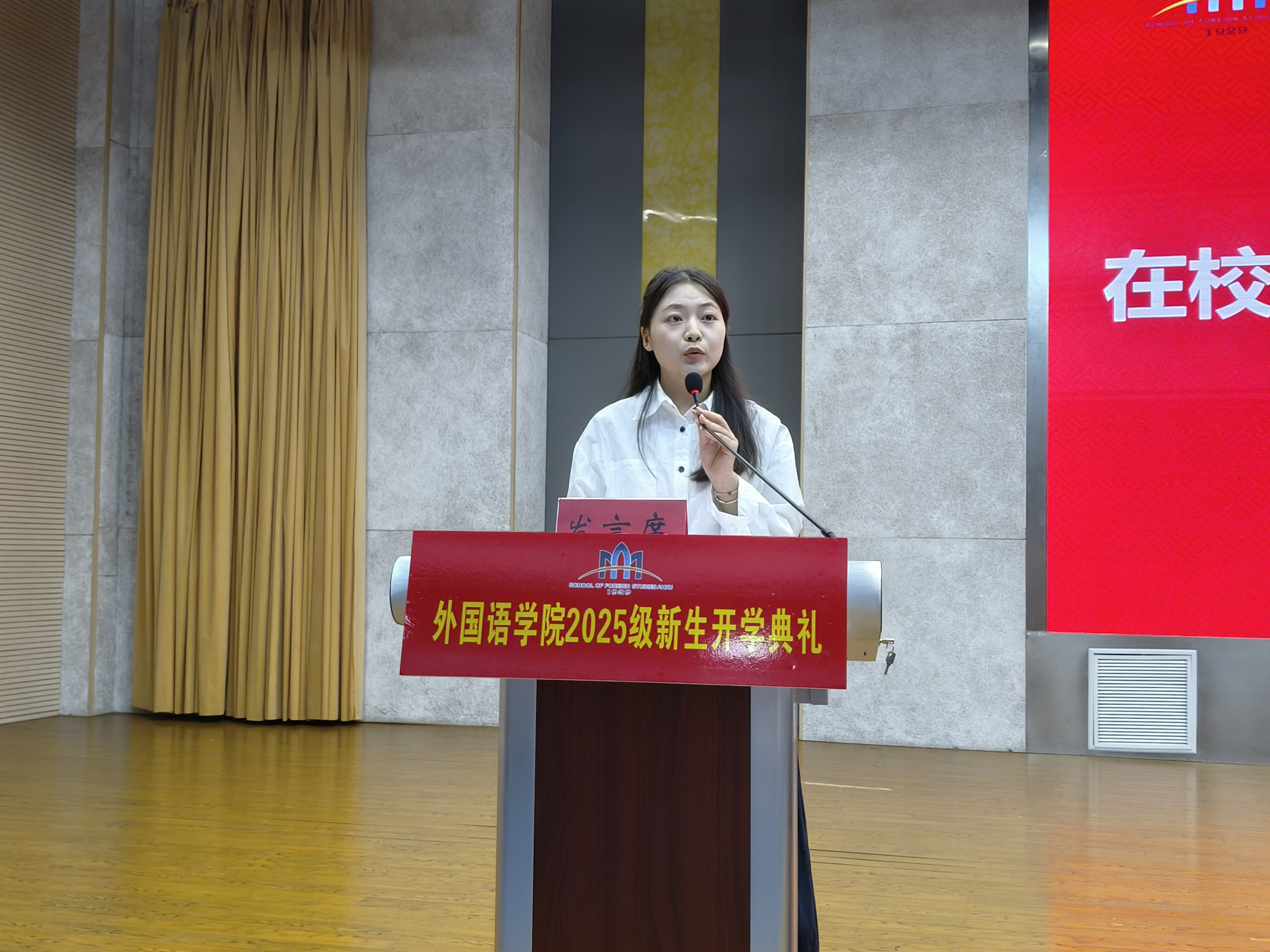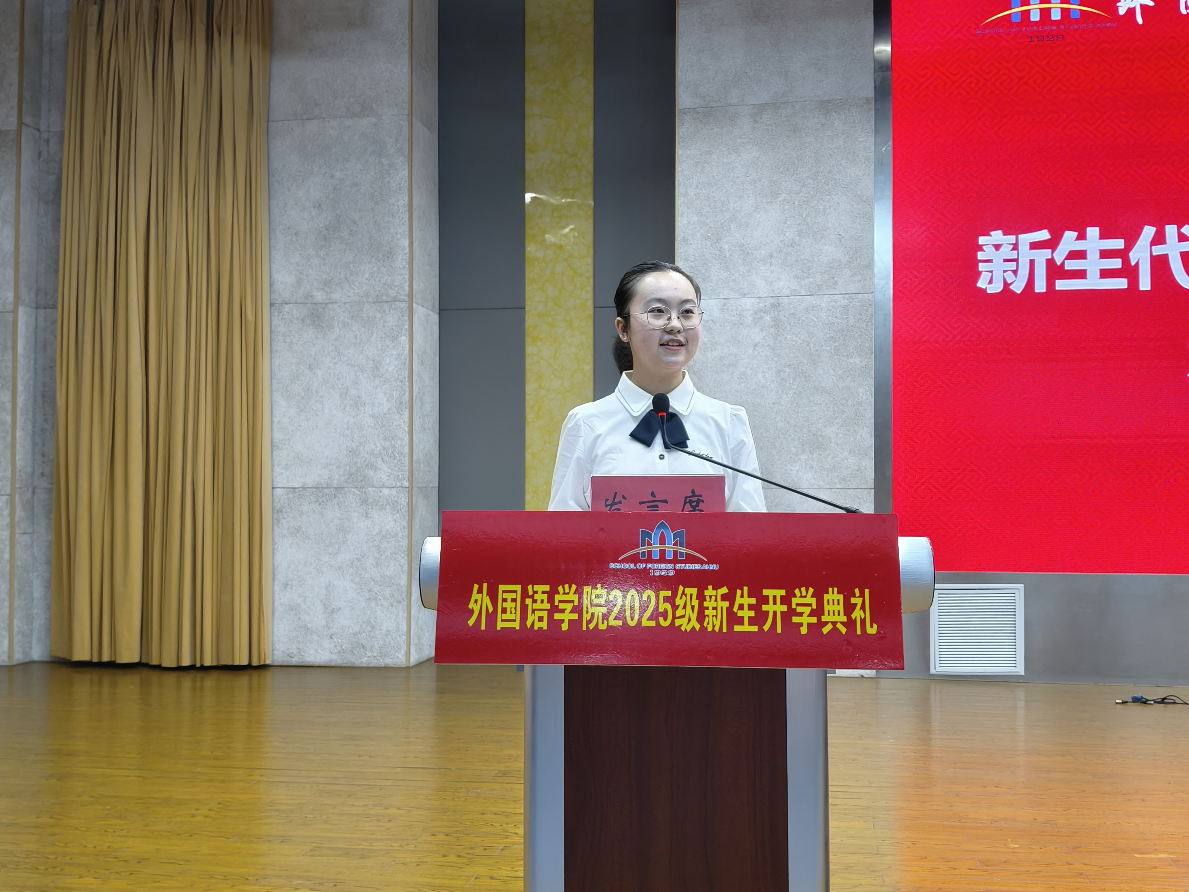 典礼在庄严的国歌声中拉开序幕。2025级英语(师范)专业刘恒桐作为新生代表发言。她以“以语言为帆,赴青春之约”为题,回顾了高中拼搏岁月,展望了大学多彩生活,表达了与全体新生共同扎根外院、勇攀语言高峰的坚定决心。老生代表、2023级学科教学(英语)专业硕士生李泽玉分享成长感悟,围绕“明晰自我、笃学不怠、勇于实践”三个方面,鼓励学弟学妹们合理规划、勤学善思、积极实践,在大学舞台上书写无悔青春。