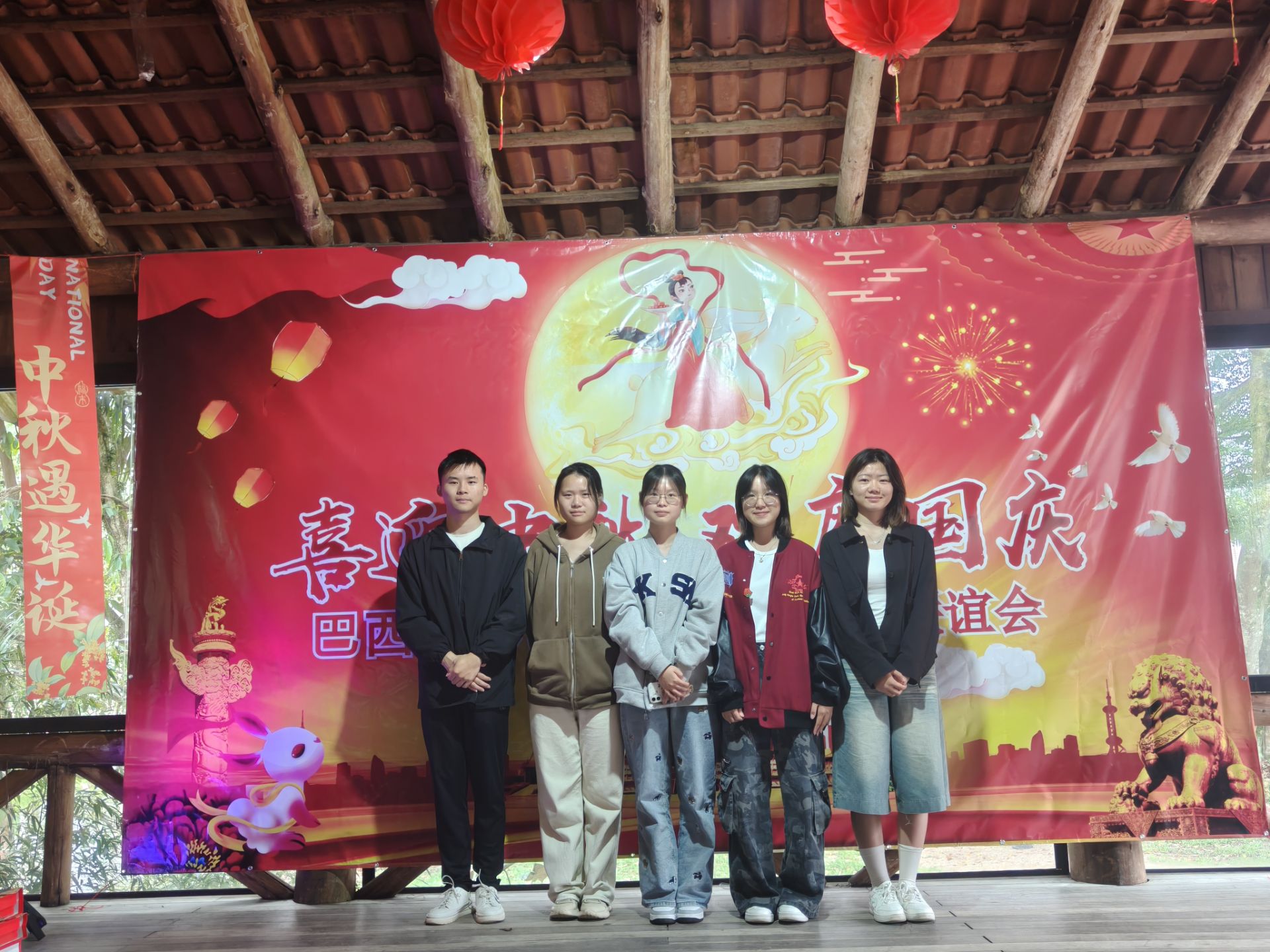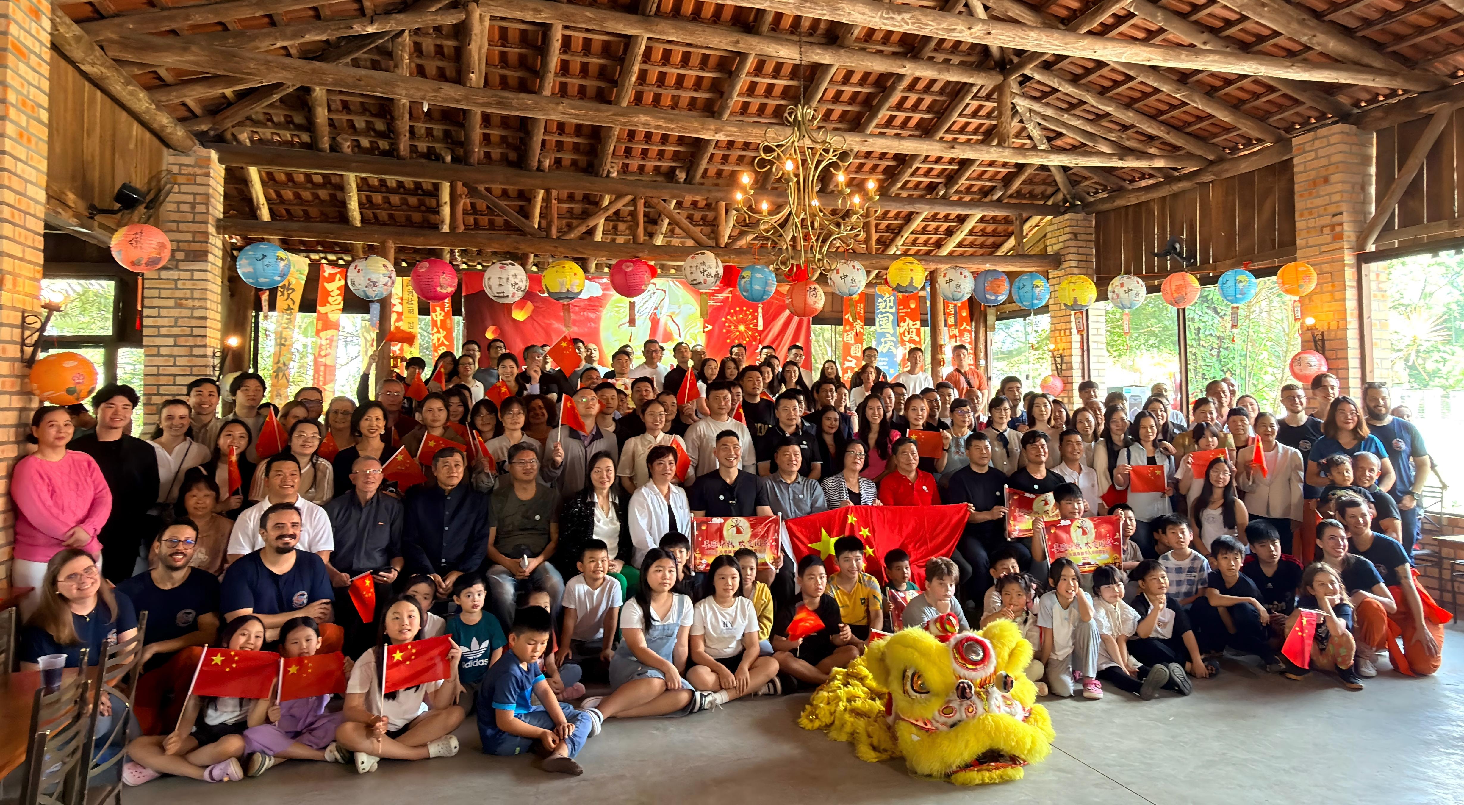 当地时间2025年10月5日下午,在中华人民共和国成立76周年华诞与中秋佳节双庆之际,外国语学院2023级葡萄牙语专业付运、戚家丽、罗曼琪、汪瑶瑶和朱永昊五位同学,正于巴西圣卡塔琳娜联邦大学交换学习期间,受邀出席了圣卡塔琳娜州华人华侨协会举办的“情满中秋,喜迎国庆”主题联谊会。同学们以出色的语言能力与跨文化素养深度参与活动,不仅展现了新时代中国青年的专业风采,也为促进中巴民间友好与文明互鉴贡献了青春力量。
