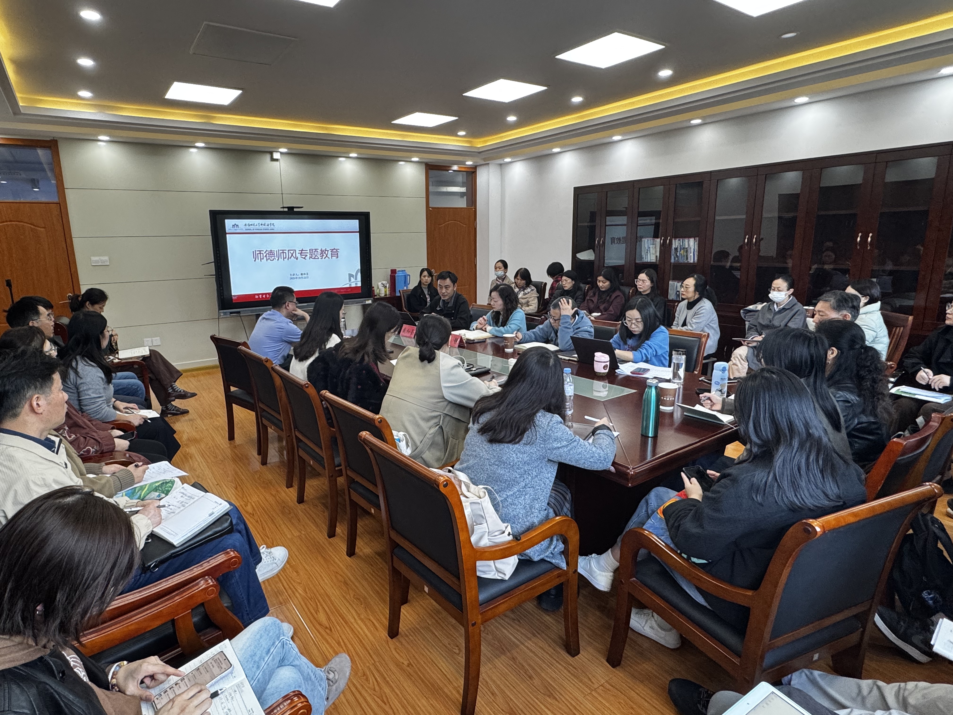 戴和圣由“新时代高校教师成长选择”话题出发,同老师们共同讨论当下高校教师面临的考核压力大、教学互动难、科研产出慢、生活负担重等普遍困境,提出分解任务指标,舒缓压力方法路径,鼓励广大教职工全力以赴积蓄能量,坦然面对考核任务。随后,戴和圣带领大家再次学习了2018年中共中央、国务院印发的《关于全面深化新时代教师队伍建设改革的意见》主要内容,重点围绕突出师德师风长效机制建设,深化高校教师人事、薪酬制度改革,推进教师教学评价体系改革,坚持创新探索等方面话题,作了深入解读和系统阐述。他还就学校近年来印发的新引进人才首聘期履职考核办法(试行)和教师系列专业技术资格评审条件(暂行)等涉及教师聘期考核、职称评聘、人才称号、评价体系等方面的制度文件,再次作了强调和提醒。他指出,全体教师应坚守道德底线,以高尚师德引领教学科研取得新突破,为培育优秀外语人才、实现长远发展筑牢思想根基。