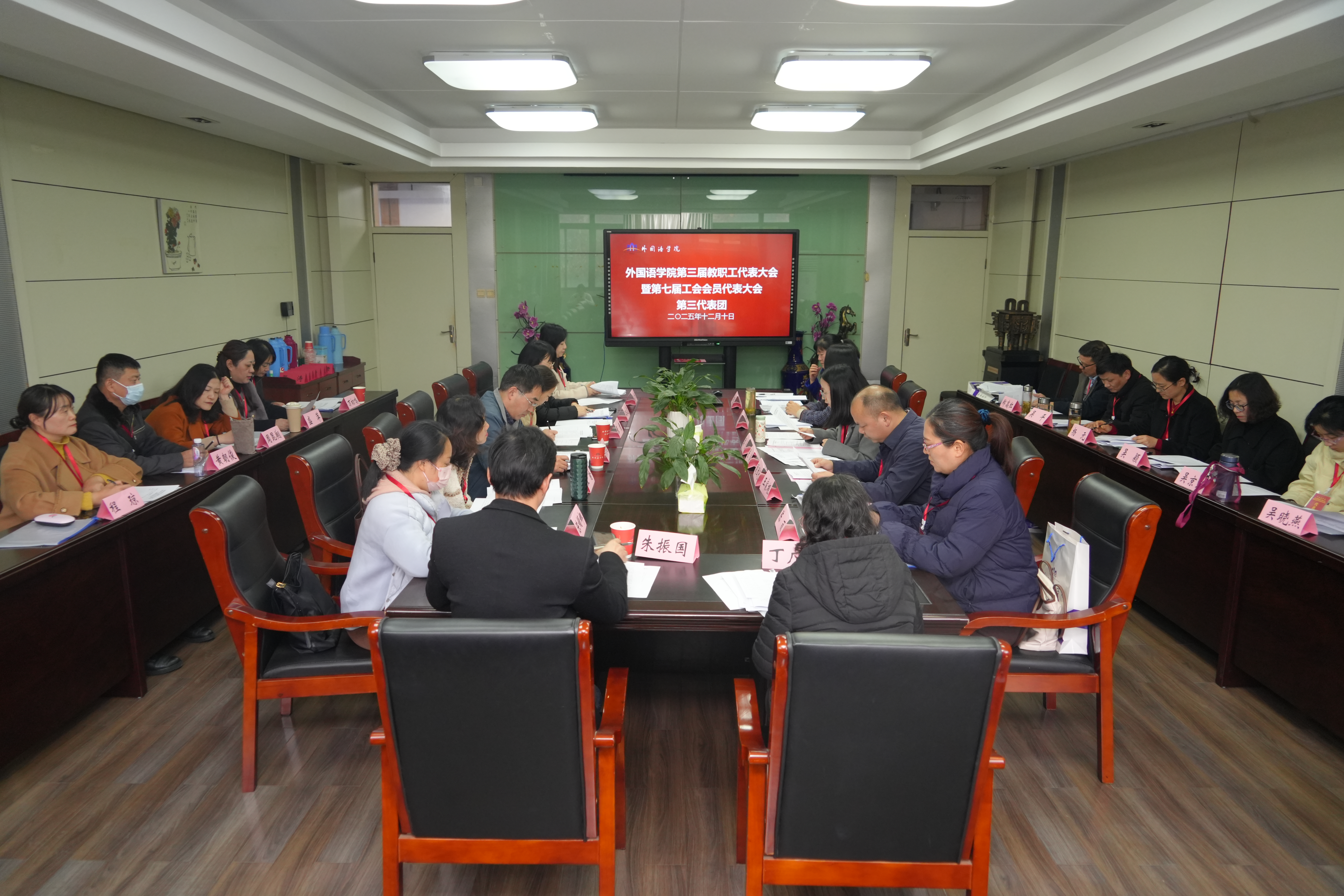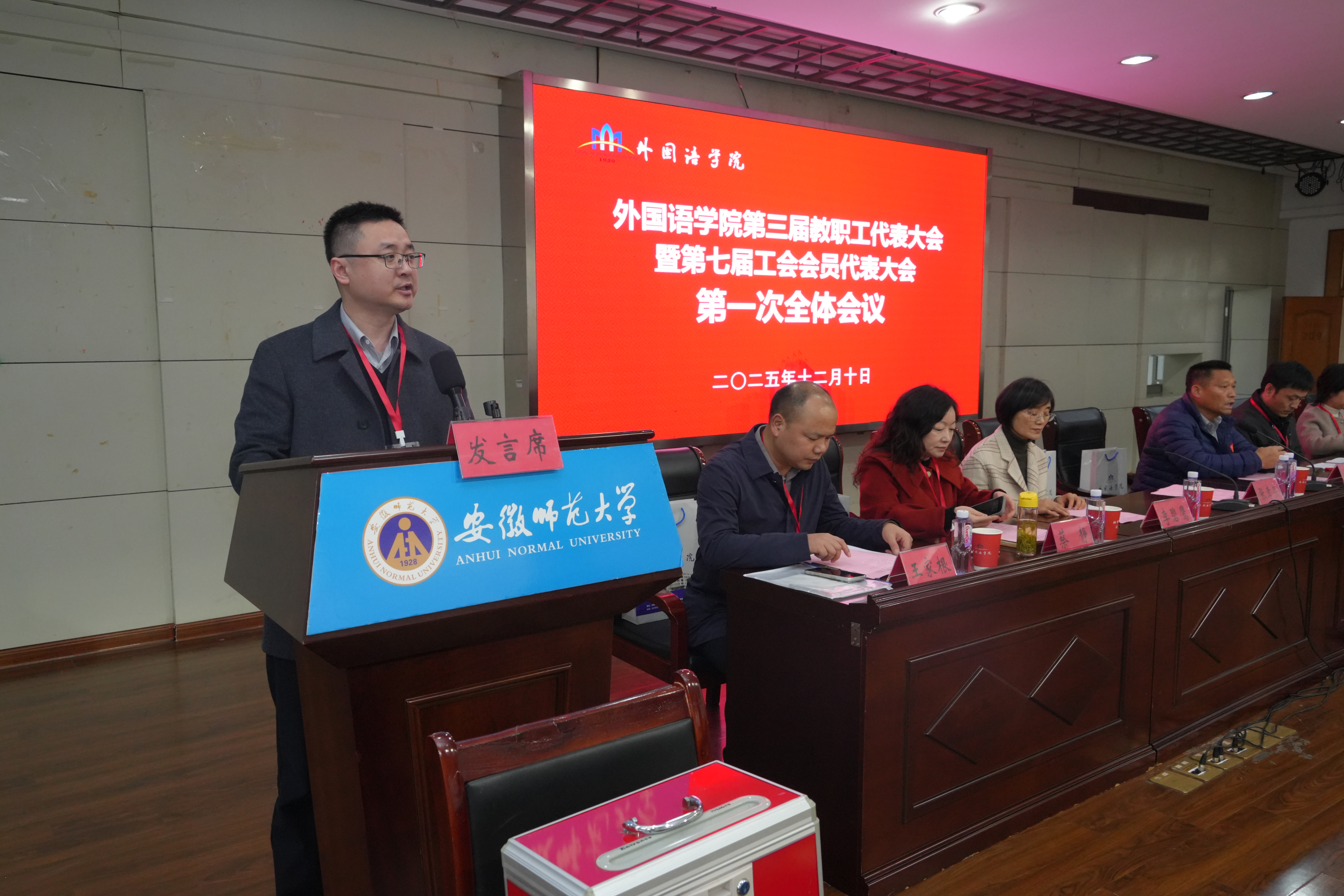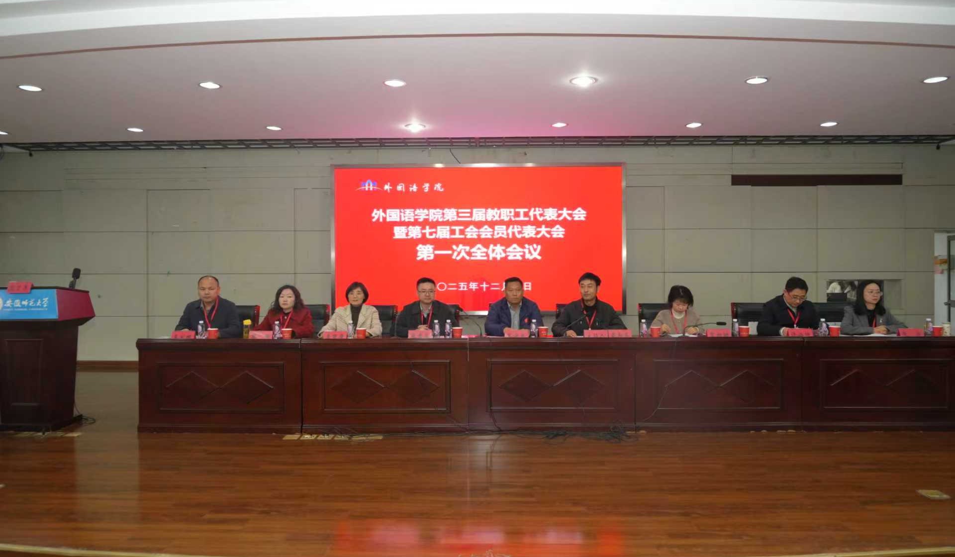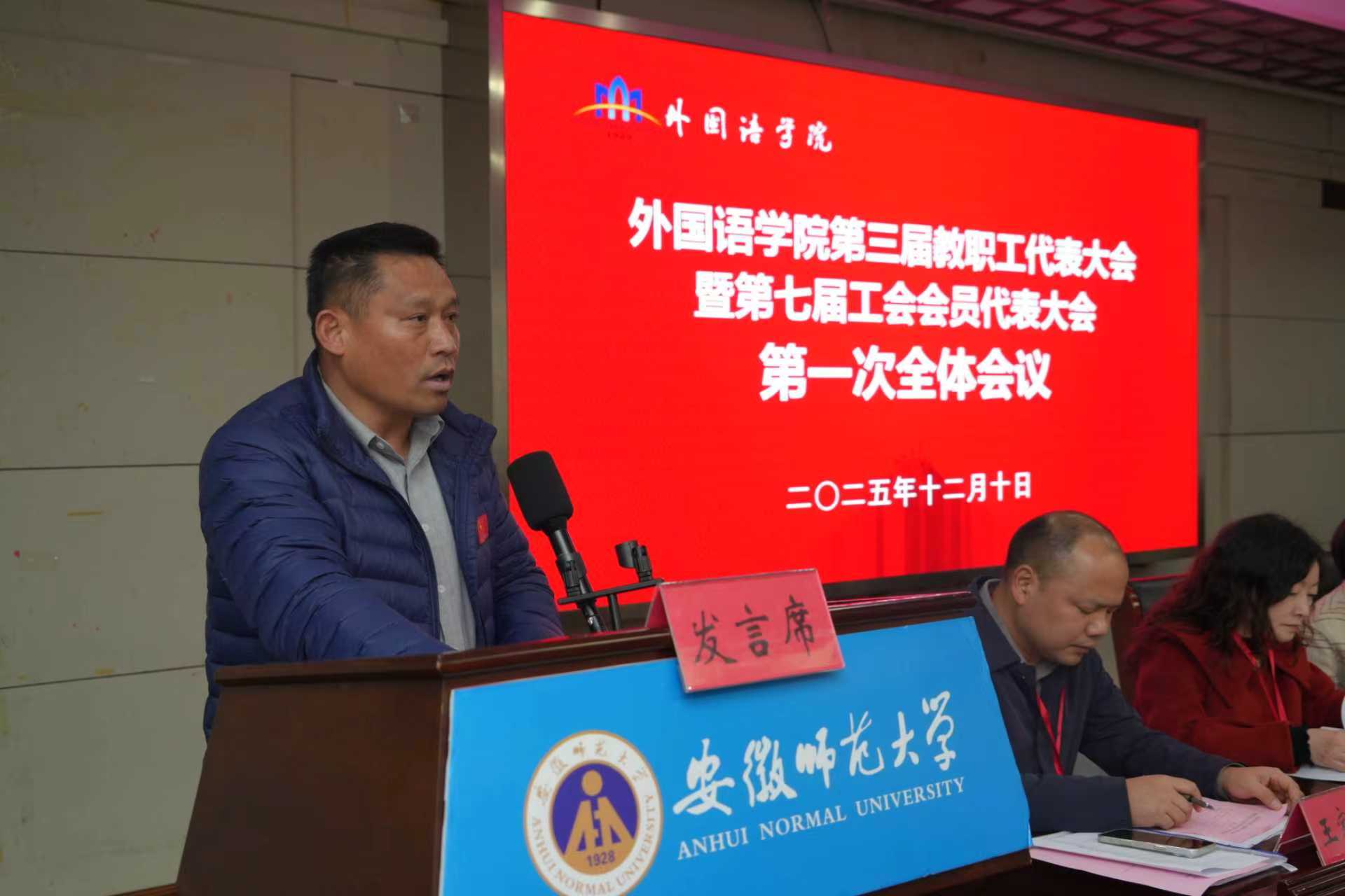 12月10日,外国语学院第三届教职工代表大会暨第七届工会会员代表大会于学院二楼报告厅隆重召开,学校教育工会副主席高守东受邀出席会议,学院教职工、工会会员代表、特邀代表等68人参加会议。学院党委书记戴和圣主持大会。