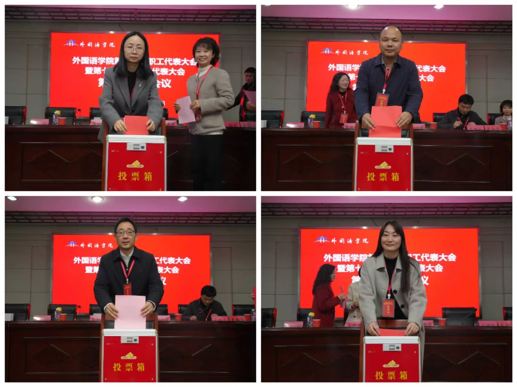 第二次全体大会上,进行两委委员正式选举,按照既定程序,大会通过了《外国语学院第三届教职工代表大会执委会委员暨第七届工会委员会委员选举办法(草案)》、监票人计票人名单、两委候选人建议人选名单等,无记名投票选举产生外国语学院新一届“两委”委员。