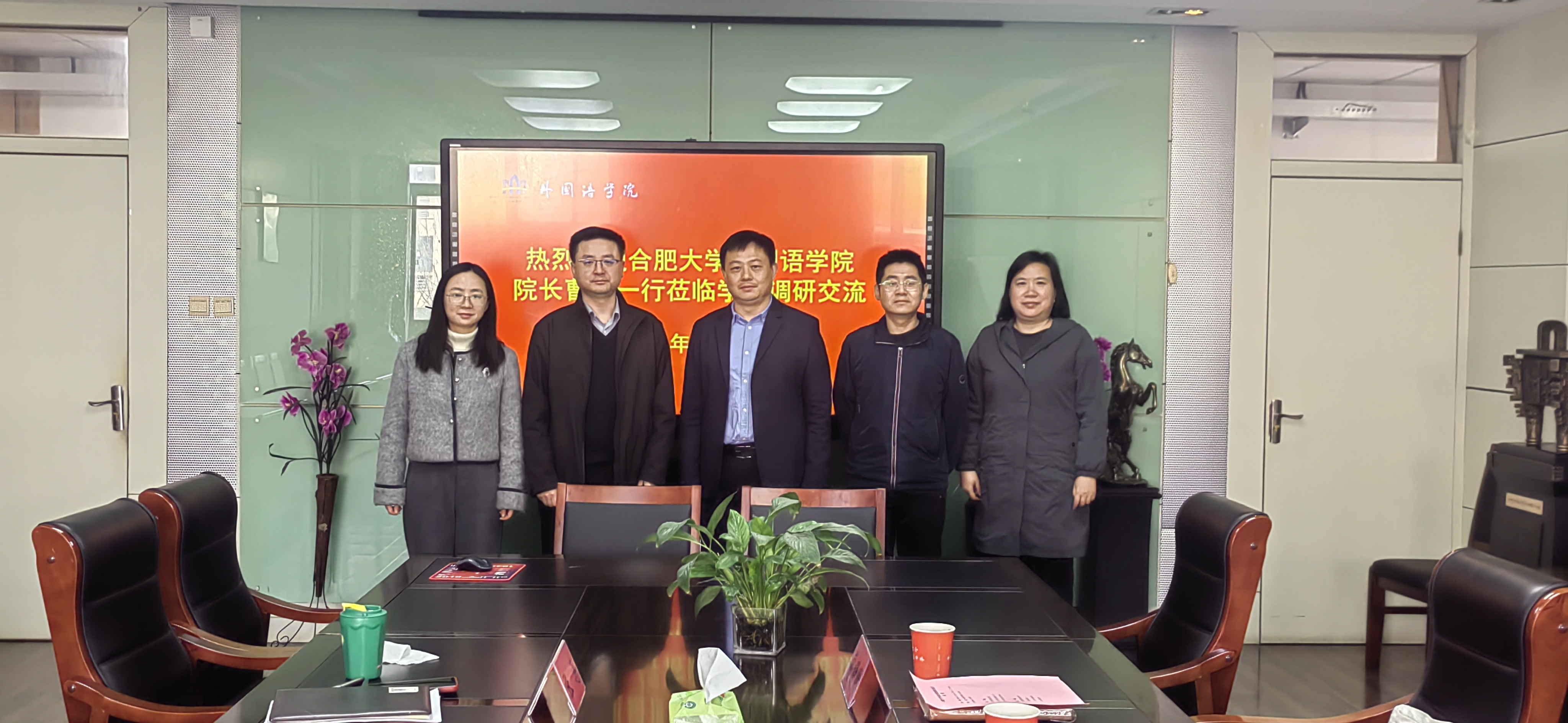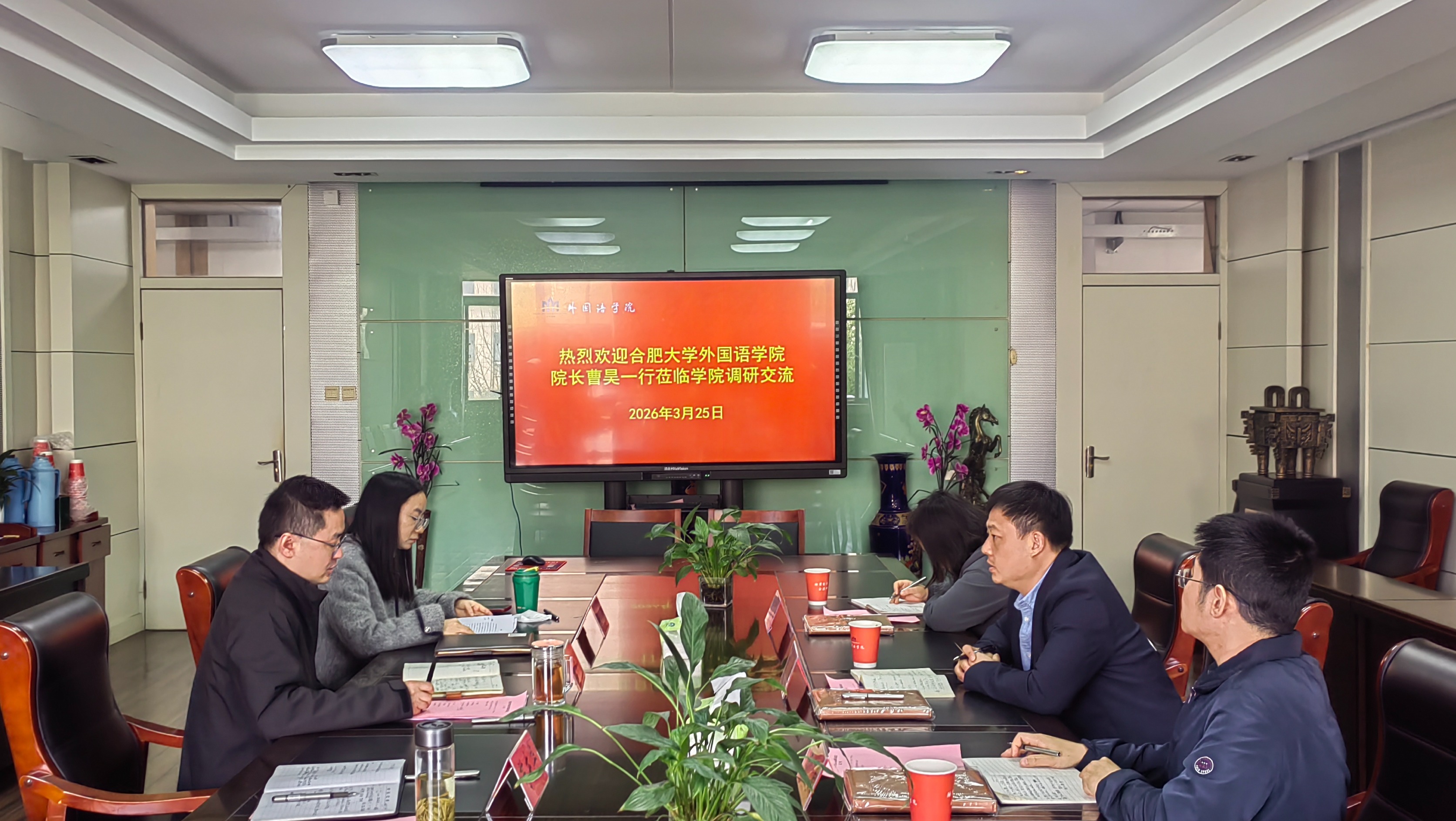为互鉴先进办学经验,推动学院高质量发展,3月25日上午,合肥大学外国语学院院长曹昊一行来院开展调研交流。我院院长张孝荣、副院长张涛、办公室主任芮东华参加座谈会。双方围绕学科建设、大学英语教学、对外交流合作等主题进行了深入研讨。