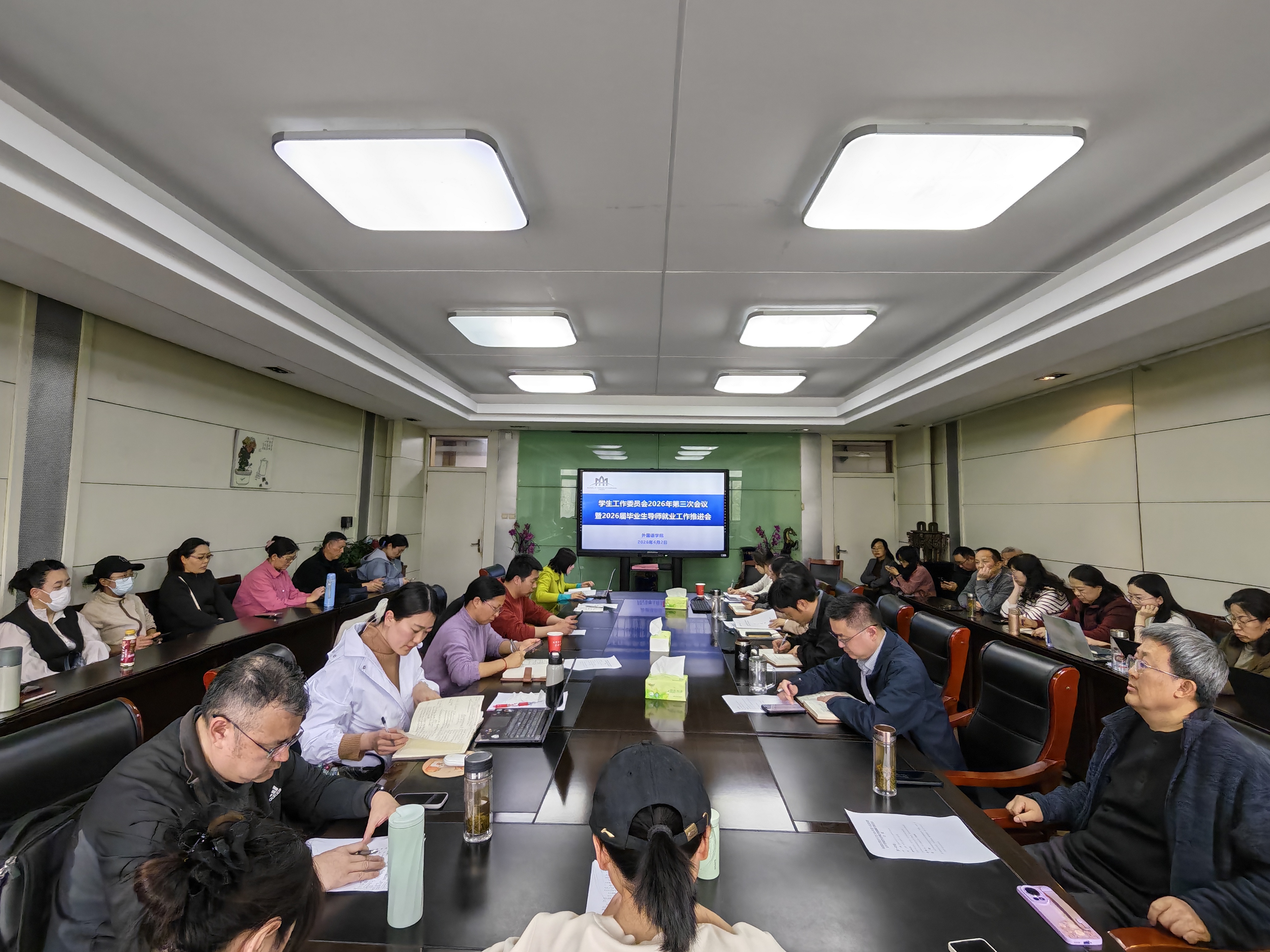为进一步促进2026届毕业生实现更加高质量更充分就业,4月2日,外国语学院召开学工委2026年第三次会议暨2026届毕业生导师就业工作推进会。学院党政班子成员,全体本科生导师、毕业班辅导员参会。会议由院学工委副主任、党委副书记章姗姗主持。