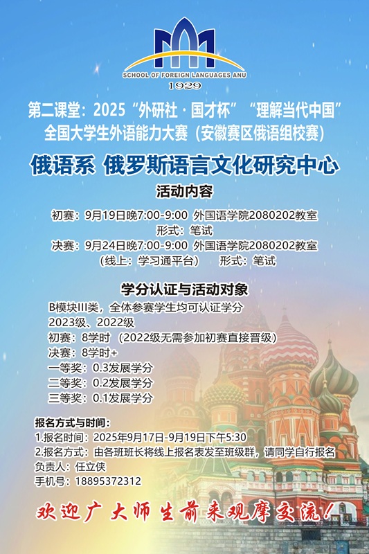 为夯实专业基本功,讲好中国故事,培养有家国情怀、有全球视野、有专业本领的复合型“三有”俄语人才,俄语系联合专外小语种党支部、俄罗斯语言文化研究中心分别于9月19日、24日举行第二课堂:2025“外研社·国才杯”“理解当代中国”全国大学生外语能力大赛(安徽赛区俄语组校赛)初赛和决赛。比赛由俄语系教师任立侠、管玲玲负责,2022、2023级12名同学参加了比赛。