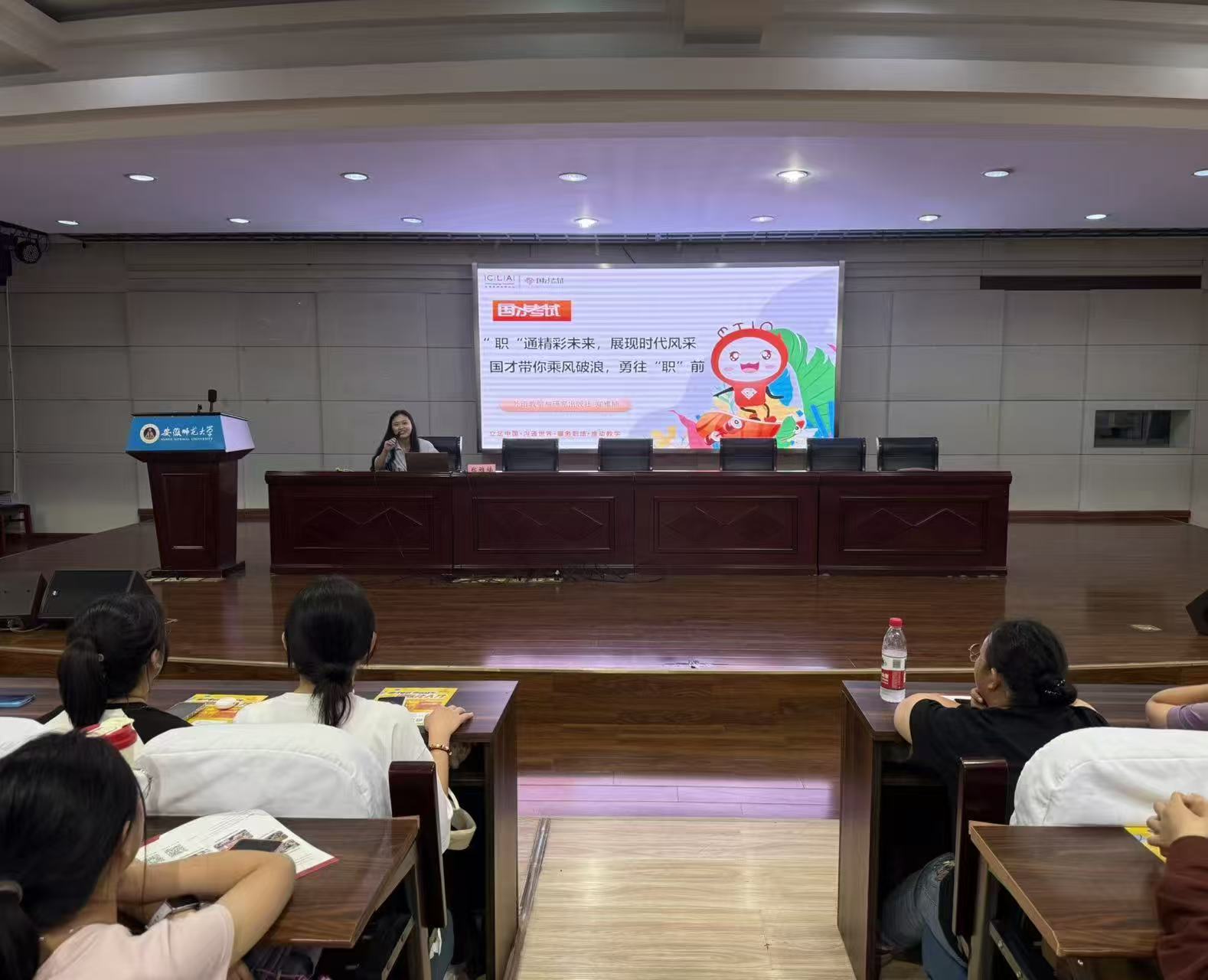 活动伊始,林绪芹简要介绍了国才考试的基本情况,并对主讲嘉宾郑雅楠的到来表示欢迎。随后,郑雅楠围绕“立足中国、沟通世界、服务职场、推动教学”的考试理念,全面解读了国才考试的设计背景与核心价值。她介绍,国才考试由北京外国语大学中国外语测评中心研发,致力于培养兼具家国情怀、全球视野与专业能力的复合型国际化人才。考试分为初级、中级、高级、高端及高翻五个级别,精准对接日常接待、一般国际交流、专业领域沟通、高层次外交交往以及专业翻译(笔译、交替传译、同声传译)等多元职场场景。郑老师特别强调了国才考试为考生提供的多元化成长支持体系。凭借优异的国才成绩,考生可获得“外研社·国才杯”系列英语赛事的外卡资格——例如在2025年安徽省省赛中,国才中级“良好”及以上成绩者即可参与晋级名额竞争;还可优先参与人民日报社、华为、网易等知名企业参访,投身北京世园会、大使随行翻译等高端志愿服务,并有机会赴海外参与国际义工与研学项目。在就业方面,多家主流招聘平台已将国才证书纳入英语能力认证标签体系,众多用人单位明确优先录用持证者,真正为学生搭建起从校园通往国际职场的“绿色通道”。