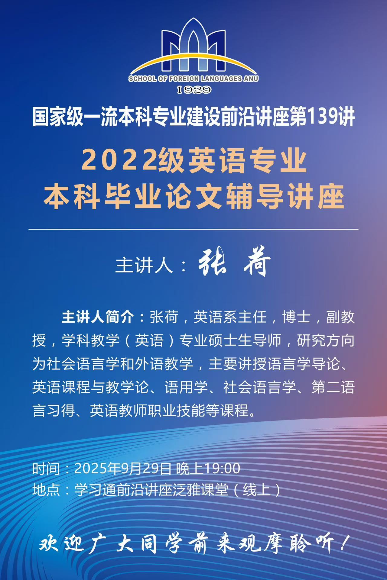 2025年9月29日晚,为帮助2022级英语(师范)专业学生更好地完成毕业论文、提升教育教学研究能力,英语系主任张荷在学习通泛雅课堂为全体2022级英语(师范)专业学生举办了一场详实的毕业论文写作指导讲座。