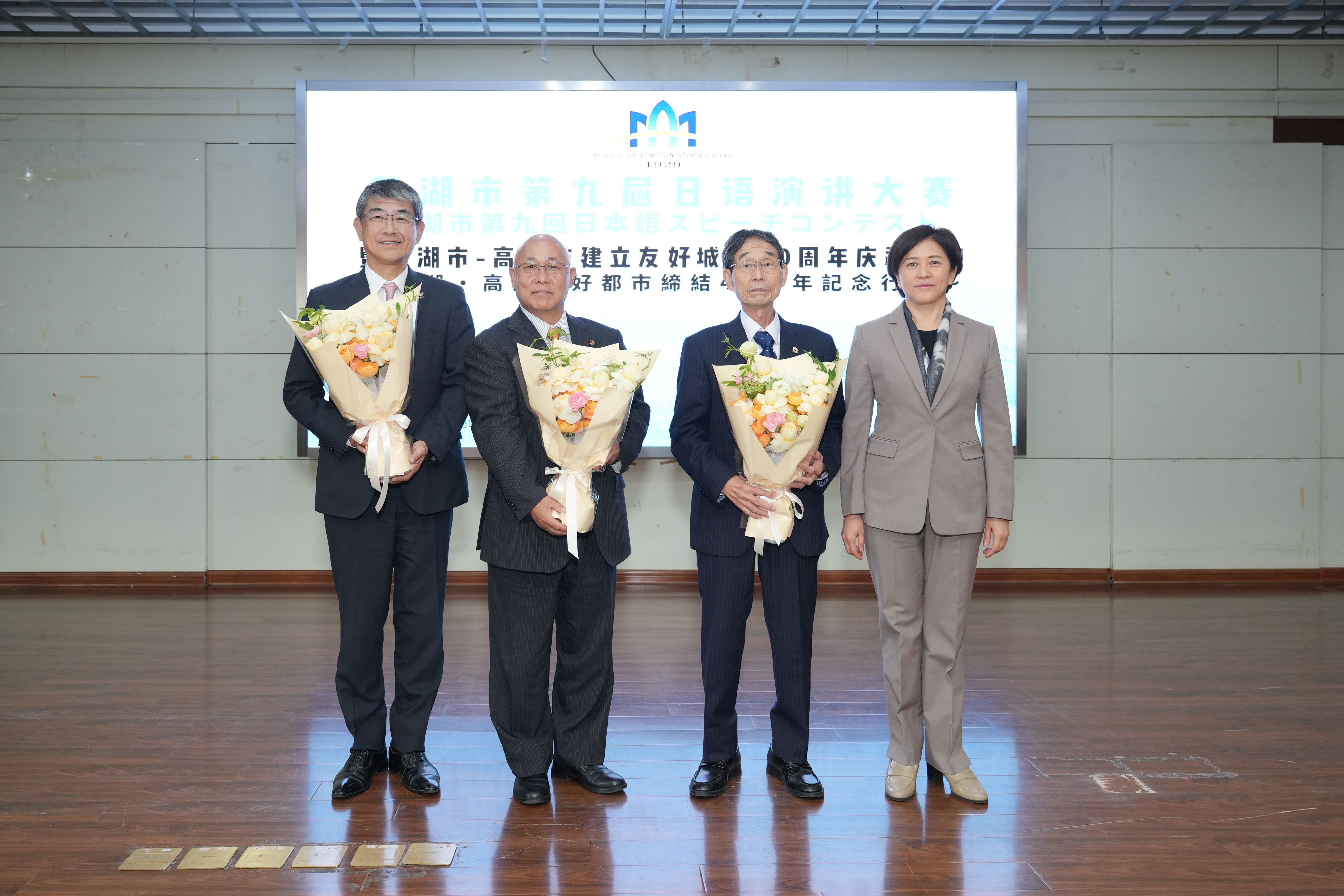 作为芜湖与高知友城结好40周年的重要庆祝活动之一,本次大赛特设欢迎仪式。芜湖市副市长丁百静向高知市市长桑名龙吾、议长清水修等日方代表献上鲜花,表达诚挚欢迎;我校日语系学生代表向桑名龙吾一行赠送了寓意吉祥的中国结,定格这一见证两市深厚情谊的难忘瞬间。