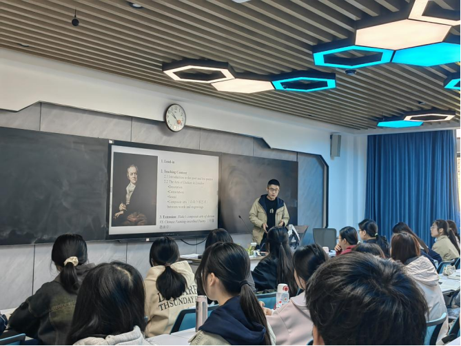 2025年10月22日上午,英语系教师周楚汉在外国语学院北楼2090508-2智慧教室开展了《英语文学导论》教学观摩课,主题为“英国诗人威廉·布莱克诗歌《伦敦》中的词语艺术”。学院教学督导组成员、文学教研室及各专业教师参与观摩,并于课后进行了集中评议与研讨。