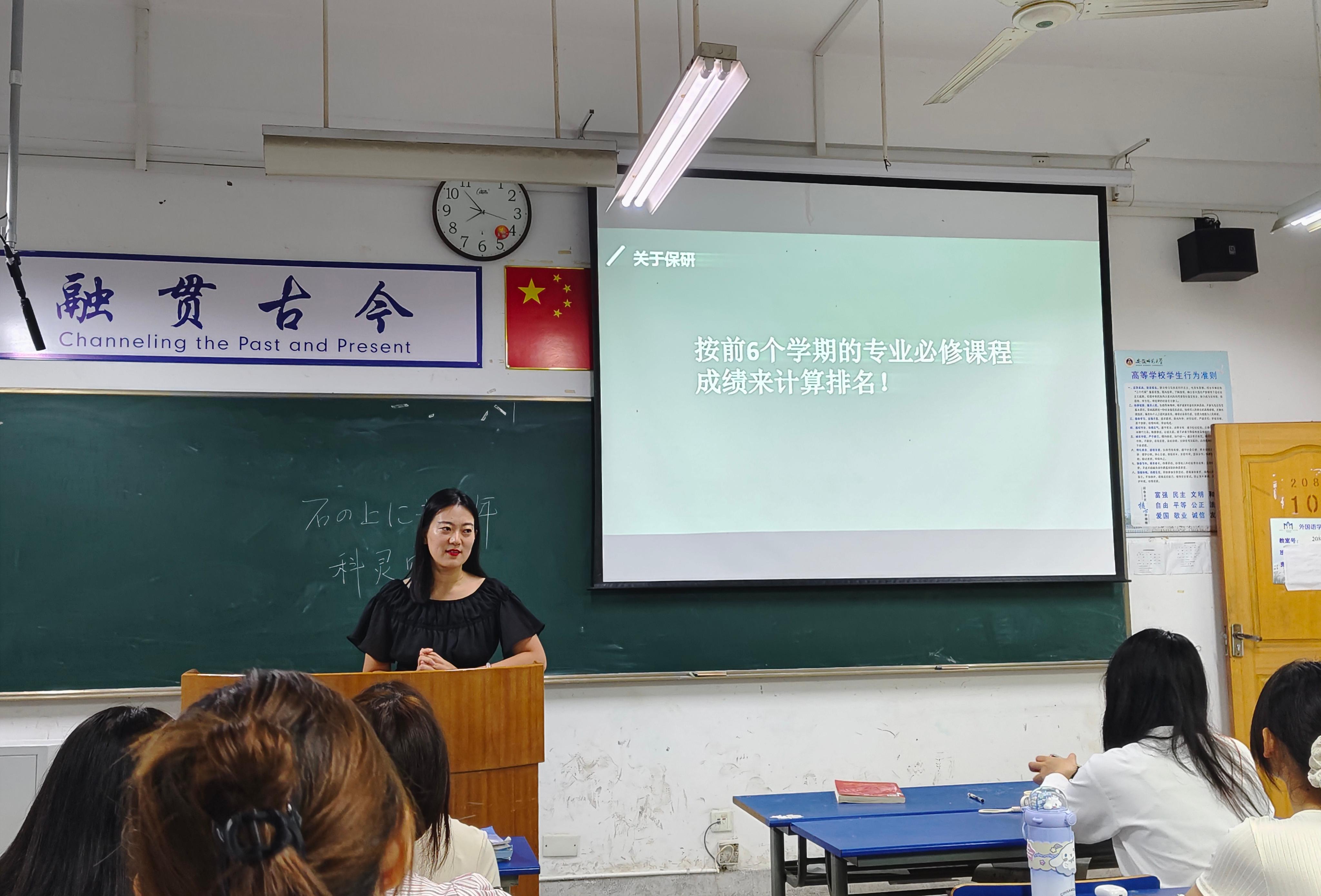 讲座伊始,陈婷婷通过播放外国语学院日语专业的宣传片,现场展示由学生拍摄的校园学习生活片段,生动呈现了日语系教师亲切自然的授课风采。陈老师围绕教师团队的专业结构、研究方向,以及近年来学生的考研录取情况与多元就业去向等做了整体介绍,为同学们进一步勾勒出较为清晰的专业前景。随后,陈婷婷向同学们系统解读了2025年日语专业人才培养方案,围绕培养目标、毕业要求、课程体系、学分学时安排、推荐免试研究生的评选规则及修读要点等内容进行了细致讲解,帮助同学们初步形成对大学四年的学习规划,为今后的专业学习与个人发展做好准备。讲座最后,陈婷婷给日语专业新生树立了一个共同目标——以自我管理和规划为路径,努力成为新时期高素质日语人才。