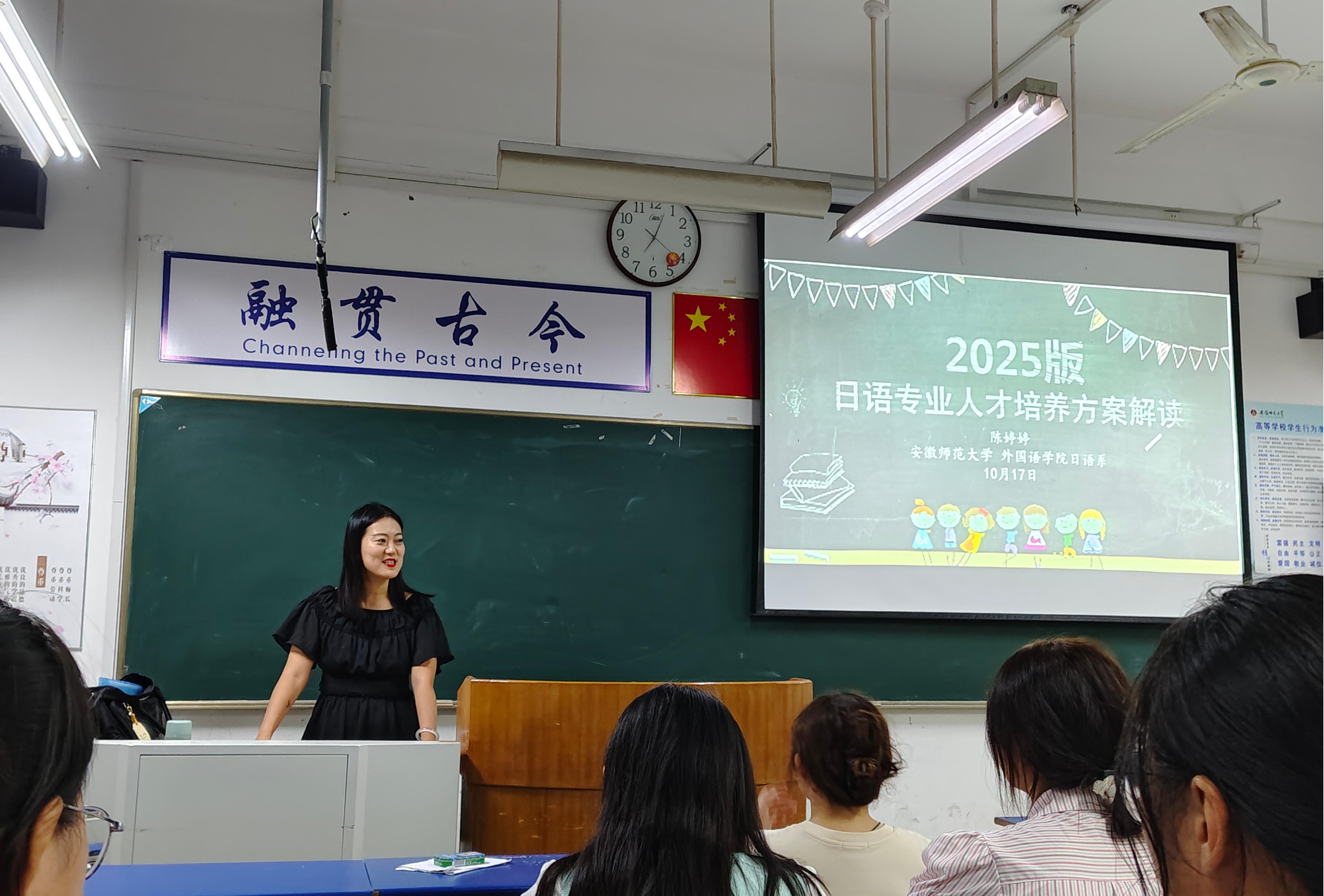 10月17日晚,我院日语系主任陈婷婷在外院南楼106教室,为2025级日语专业全体新生开展了一场题为“日语专业人才培养方案解读”的专题前沿讲座。