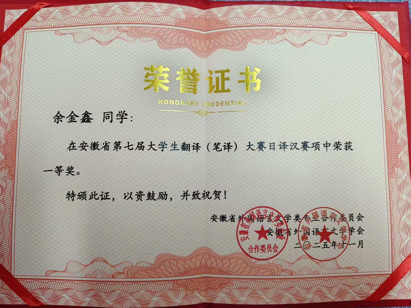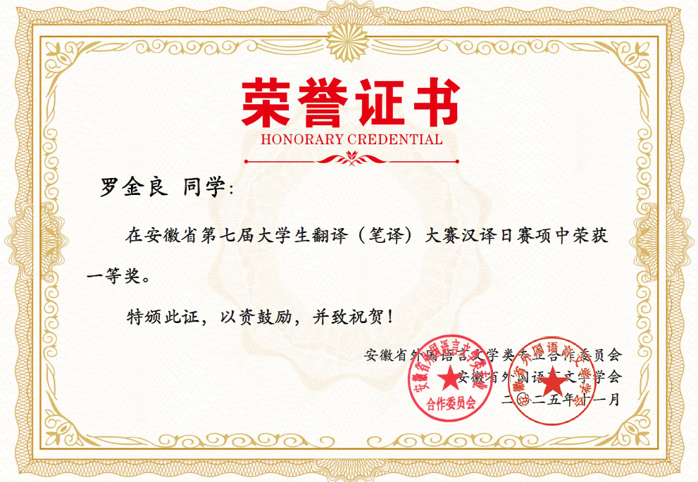 在备赛过程中,罗金良与余金鑫同学在指导教师的悉心指导下,系统梳理翻译技巧,反复打磨译文。参赛作品以准确流畅的语言、对文化内涵的精准把握,获得了评委的高度认可。日语系坚持“夯实基础、拓展视野、服务地方”的人才培养思路,鼓励学生在掌握语言技能的同时,积极关注安徽发展,增强本土文化传播意识。此次成绩的取得,不仅体现了日语专业学子扎实的语言功底与跨文化沟通能力,也反映了日语系“以赛促学、以赛促教”教学理念的有效实践,彰显在翻译人才培养方面的稳步提升与扎实成效。