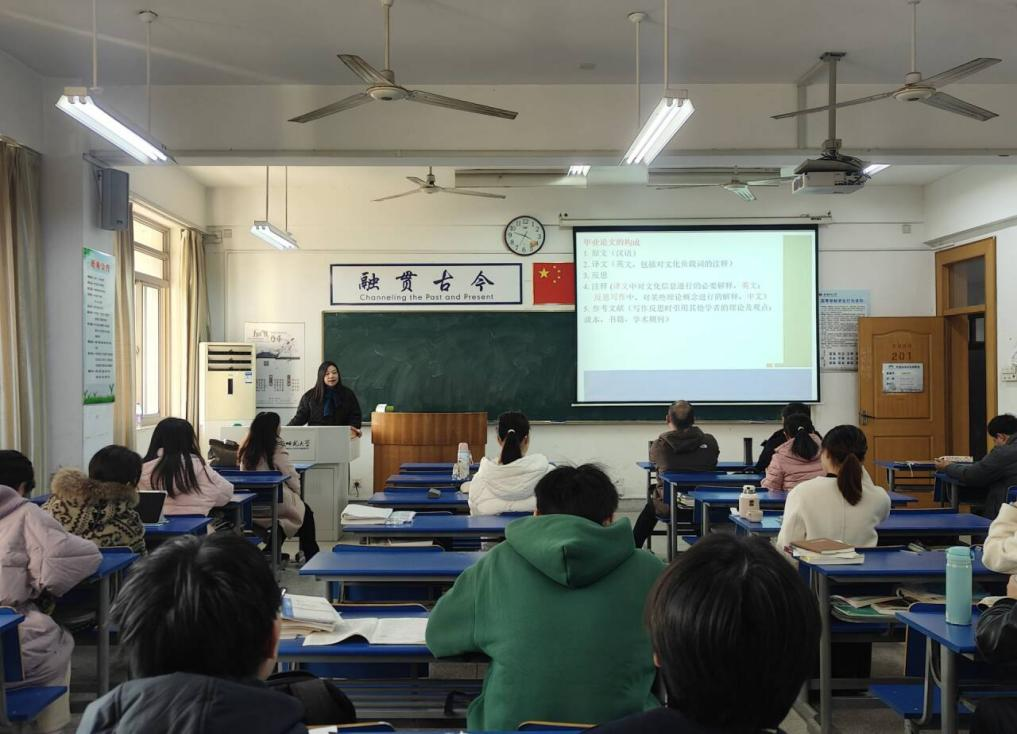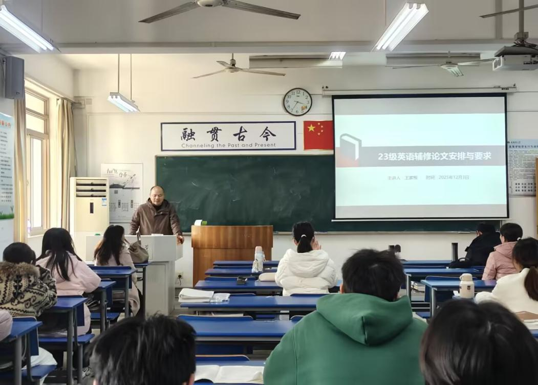 12月3日下午,2023级英语辅修专业毕业论文启动会在外国语学院2080201教室如期举行。会议由2023级英语辅修专业班主任林绪芹老师主持,辅修英语专业负责人王家根老师、论文辅导教师胡婷婷老师、全体论文指导教师以及2023级英语辅修专业全体学生参加。本次启动会旨在为即将开展的翻译实践类毕业论文写作工作明确要求、梳理思路,并搭建师生之间高效沟通的桥梁,确保后续论文指导与撰写工作有序推进。
