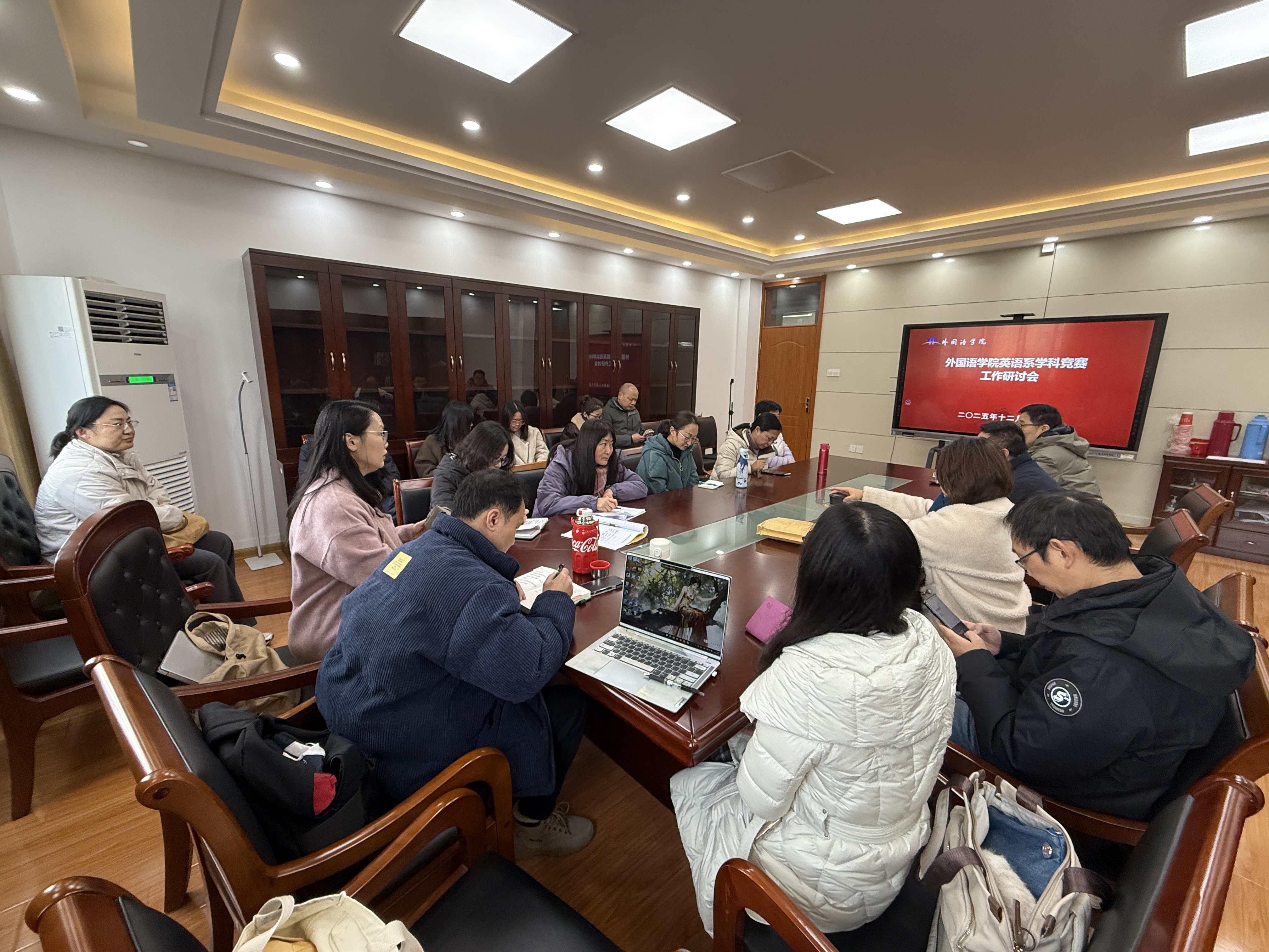 2025年12月30日上午,英语专业学科竞赛专题研讨会在学院迎评办公室召开。会议由英语系主任张荷主持,学院院长张孝荣、副院长许炳坤,各学科竞赛指导教师参加会议。
