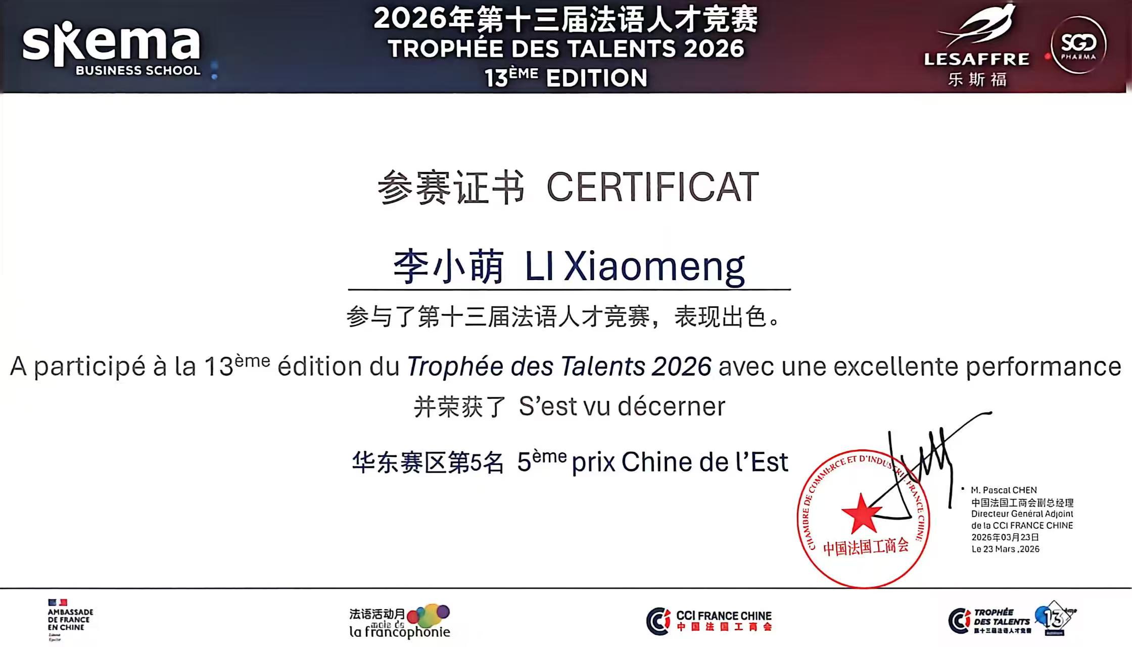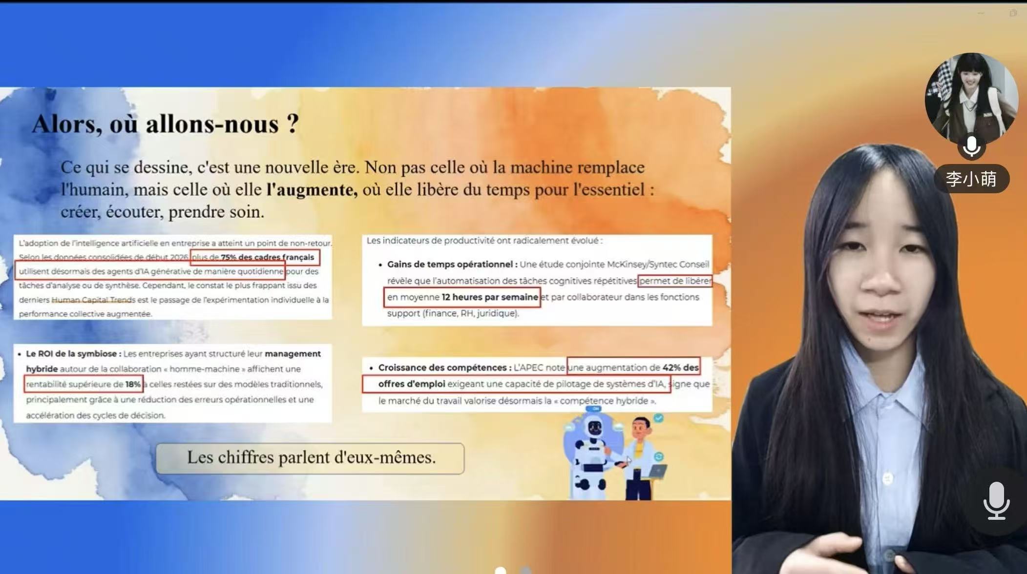 本届竞赛大赛以« Dans un monde en constante évolution, comment l’innovation, portée par les talents et la créativité humaine, et enrichie par les technologies et l’intelligence artificielle, peut-elle devenir un levier durable de croissance et de compétitivité pour les entreprises ? »(“在持续变革的世界中,创新以人才与人的创造力为引擎,又借助技术与人工智能不断丰富——这样的创新如何持续推动企业实现可持续增长与竞争力提升?”)为主题,全方位考察选手的法语综合能力、思辨深度与跨文化视野。经过校内选拔,法语专业2023级学生李小萌作为我校代表参赛,她在专业教师胡迅、费昕昕和外教Sandy的悉心指导下,于初赛中脱颖而出,成功进入华东赛区的面试筛选环节,最终取得华东赛区第5名的优秀成绩,这也是迄今为止法语系在该项赛事上获得的最佳成绩。学院将继续加强法语专业的建设和发展,努力培养出更多具有家国情怀、全球视野和专业本领的复合型外语人才。