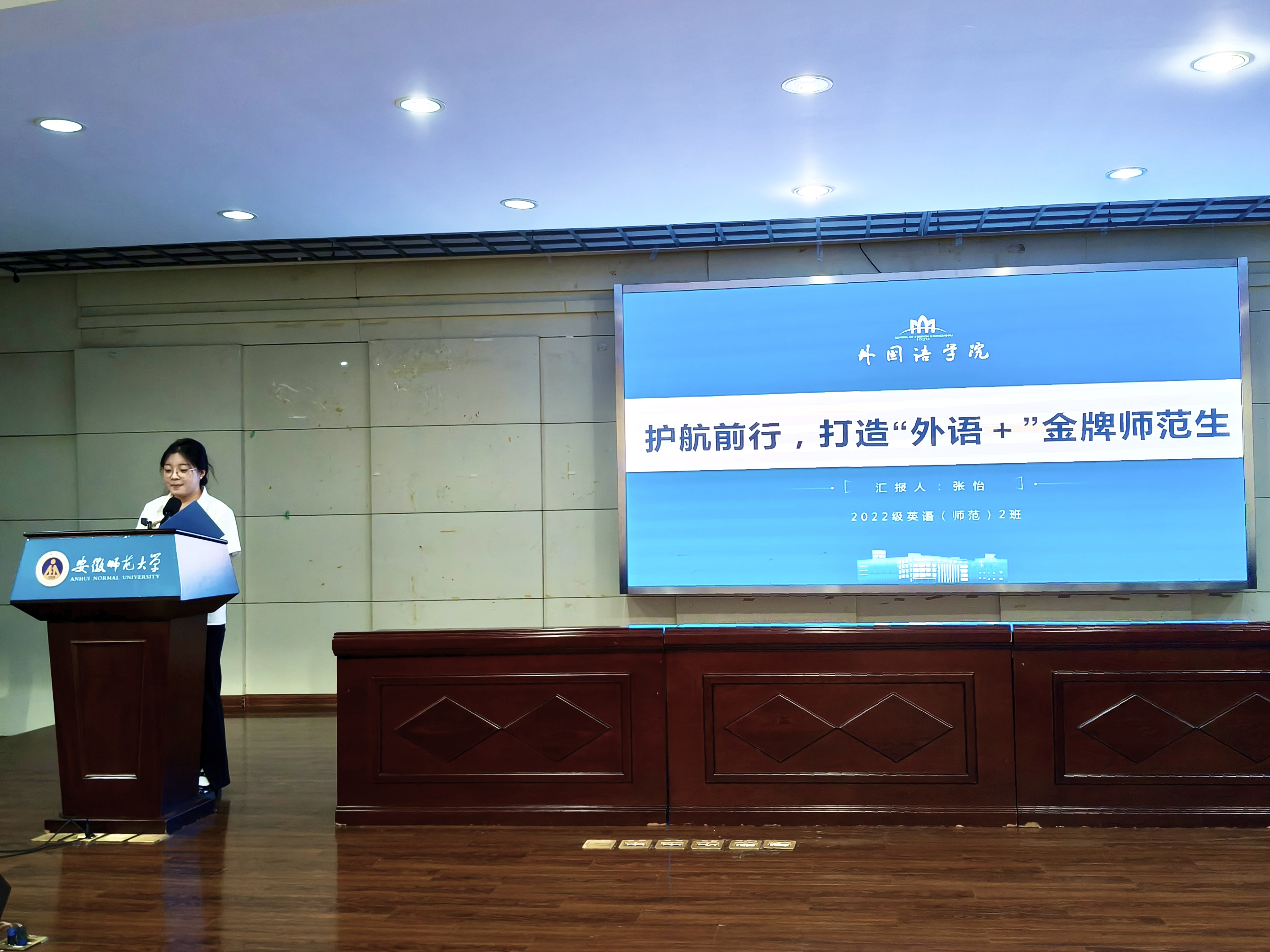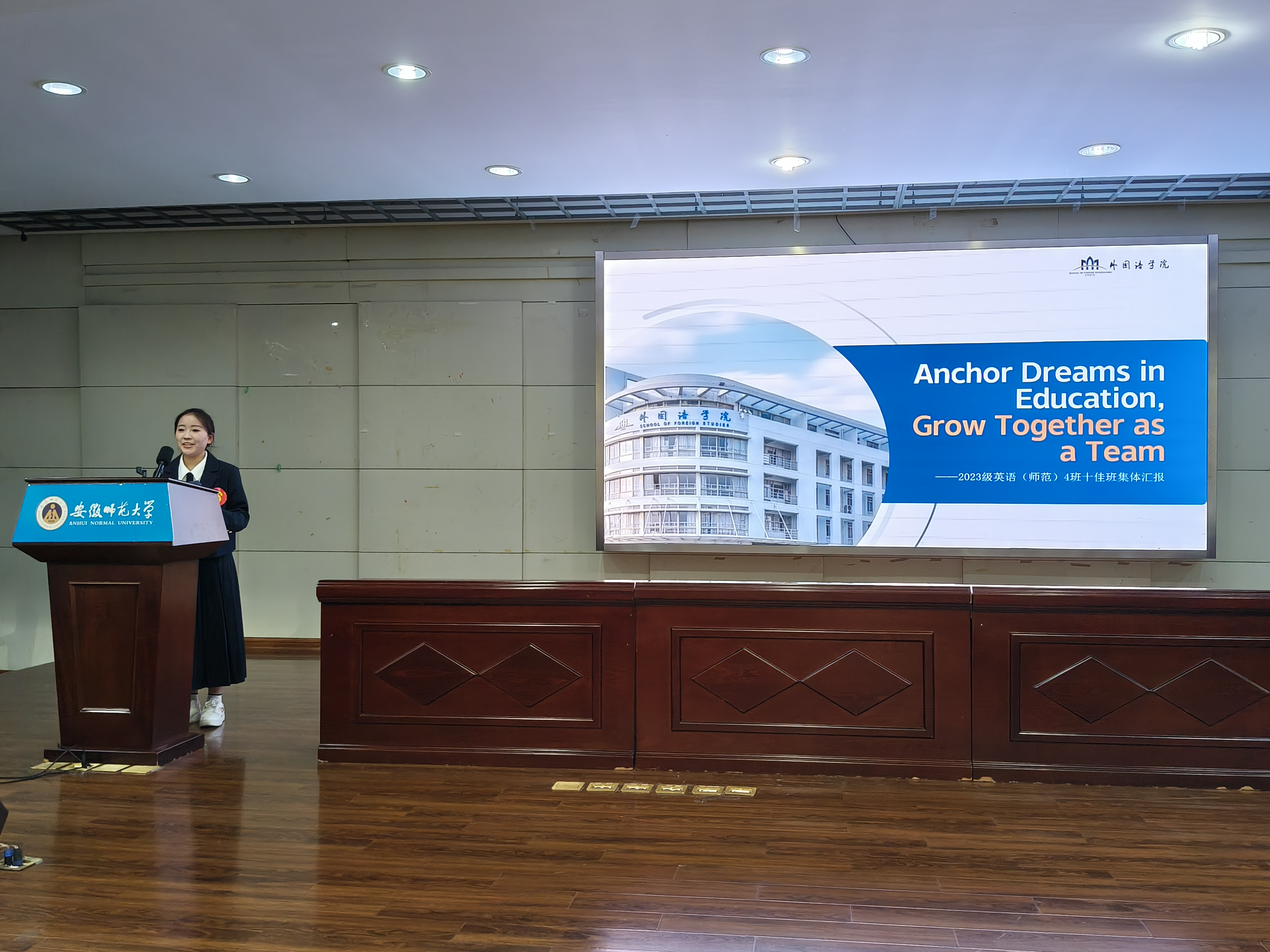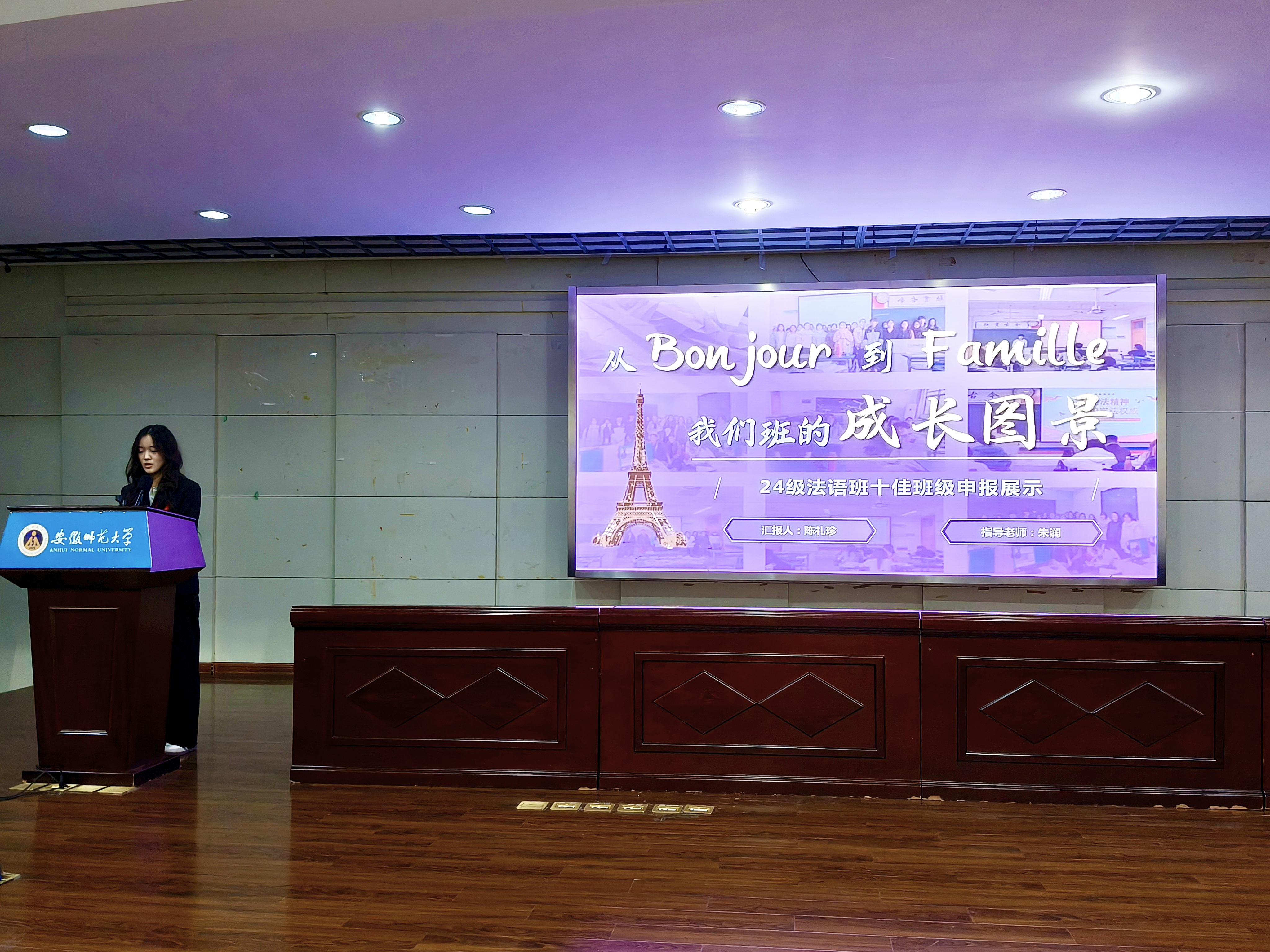 本次共有15个班级参评“十佳班集体”评选,各班以PPT形式,围绕组织建设、思想引领、学风建设、基础文明等核心维度,对上一学年班级工作进行全面系统的总结。2022级英语(师范)2班以“护航前行”为主题,汇报班级建设成果,展现出班级在各个方面取得的亮点与成就,树立“金牌师范生”的共同目标;2023级英语(师范)1班则从思想建设、文明建设和实践活动等模块入手,汇报班级建设的详细过程及丰厚成果,2023级英语(师范)4班以赛促学、党团联动,彰显了班级个体与共体相融合的浓厚底色。