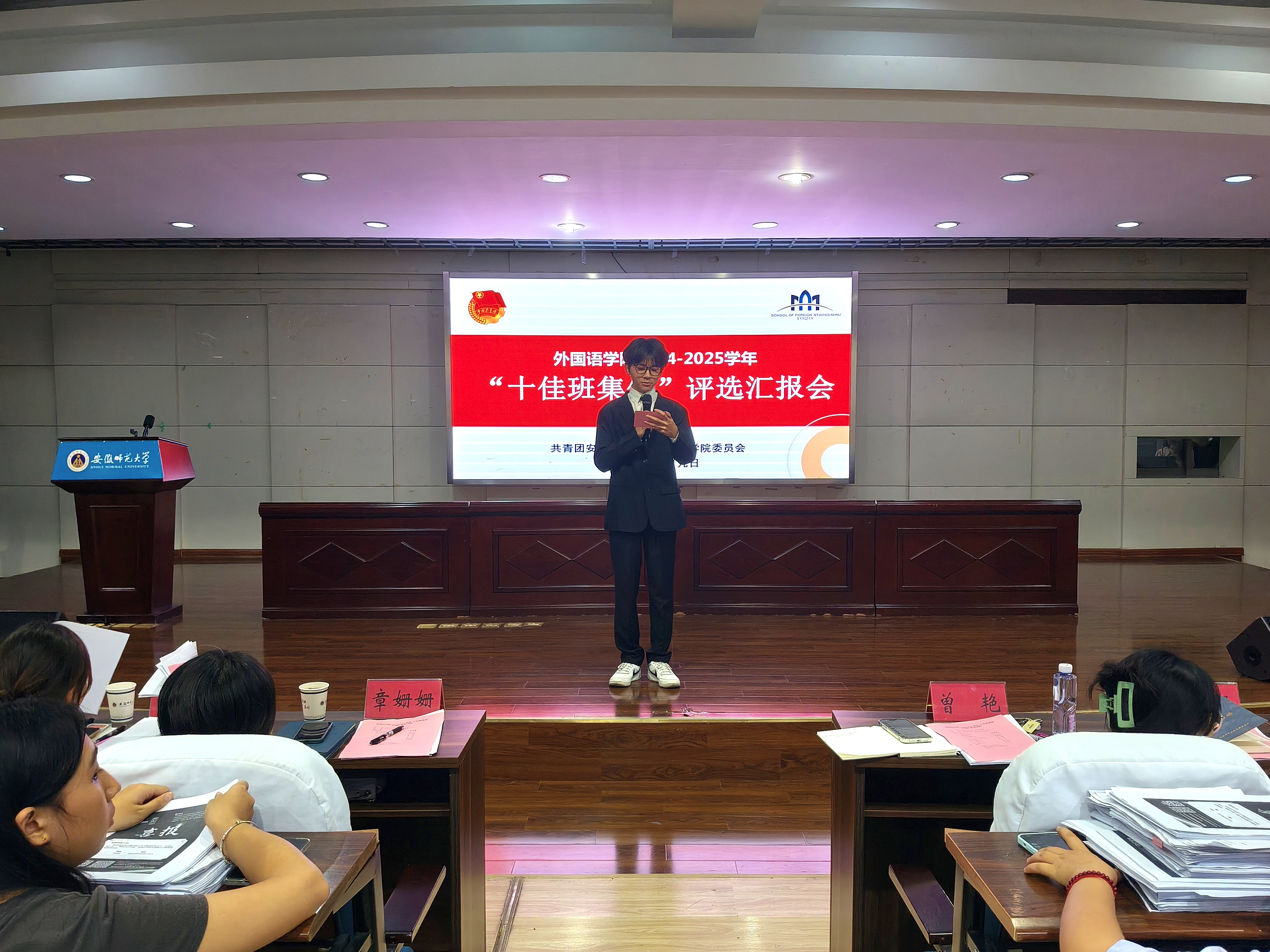 为增强班级凝聚力,推进优良校风学风建设和发挥先进班集体的示范作用,学院于10月9日晚上在学院二楼报告厅举行了学院2024-2025学年“十佳班集体”汇报评选会。学院党委副书记章姗姗、学院团委书记及全体辅导员出席此次活动并担选评委,参评班级代表和2024级学生代表参加本次汇报会。