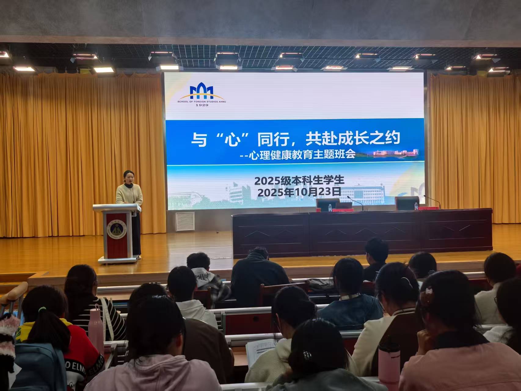 为进一步宣传普及心理健康知识,化解心理危机,促进学生身心健康全面发展,10月23日,2025级开展了以“与‘心’同行,共赴成长之约”为主题的心理健康主题班会。本次班会由辅导员范明雨主持,全体2025级学生参加此次班会。