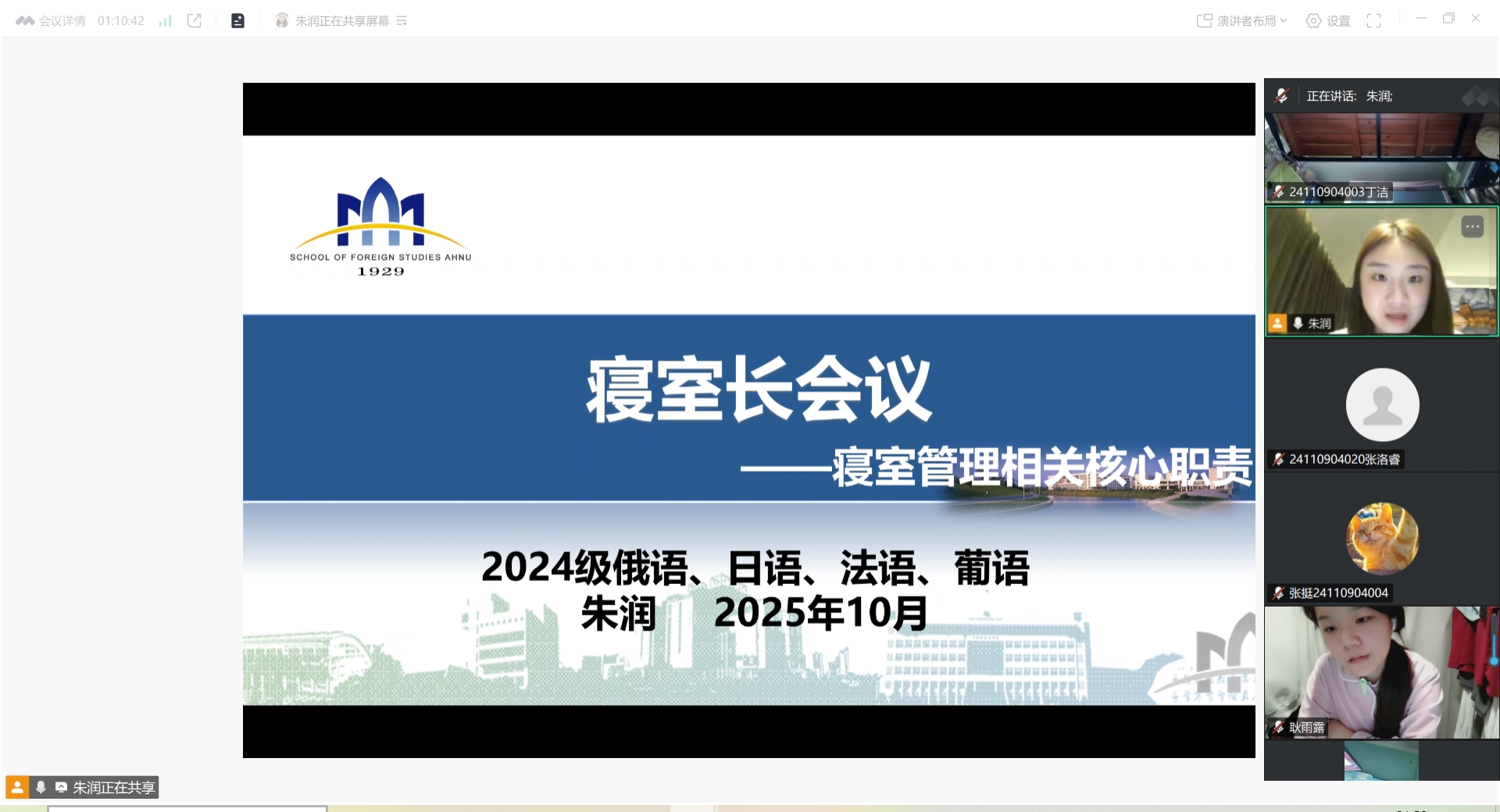 会议最后,辅导员勉励全体寝室长发挥“定海神针”作用,学院将作为全院同学的坚强后盾,共同营造安全、和谐、向上的寝室氛围。