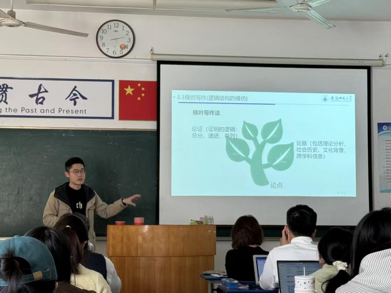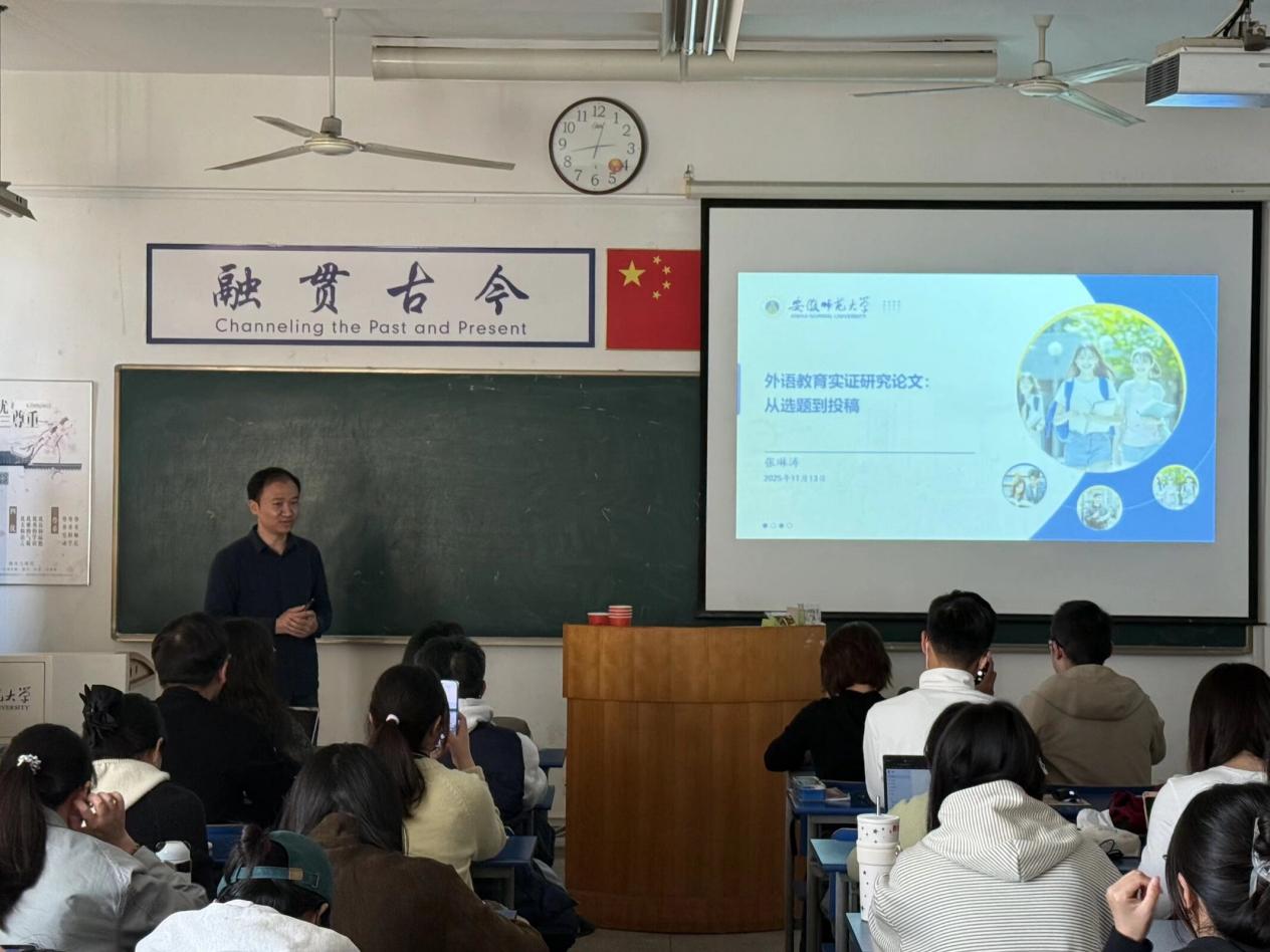 张琳涛的讲座聚焦实践、干货满满。他围绕选题来源、文献阅读与整理、写作注意事项、投稿建议四大模块展开讲解,系统阐述了外语教育实证研究的方法与规范。张老师指出,选题可立足于个人教学兴趣,关注课程、教材等实践问题,也可从学术会议热点中汲取灵感。他着重强调,论文写作要严格遵循标准结构和规范,建议从SSCI、CSSCI等高水平期刊论文入手进行模仿学习。最后,他详细介绍了期刊投稿的核心要点及实用技巧,为同学们开展实证研究提供了清晰且可操作的指引。