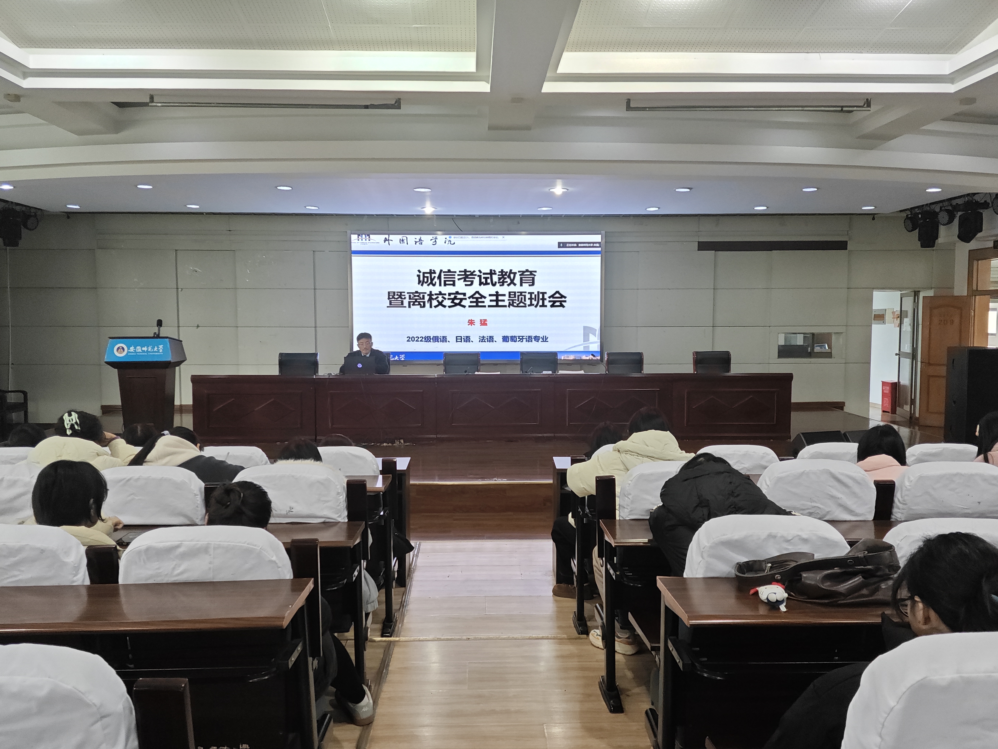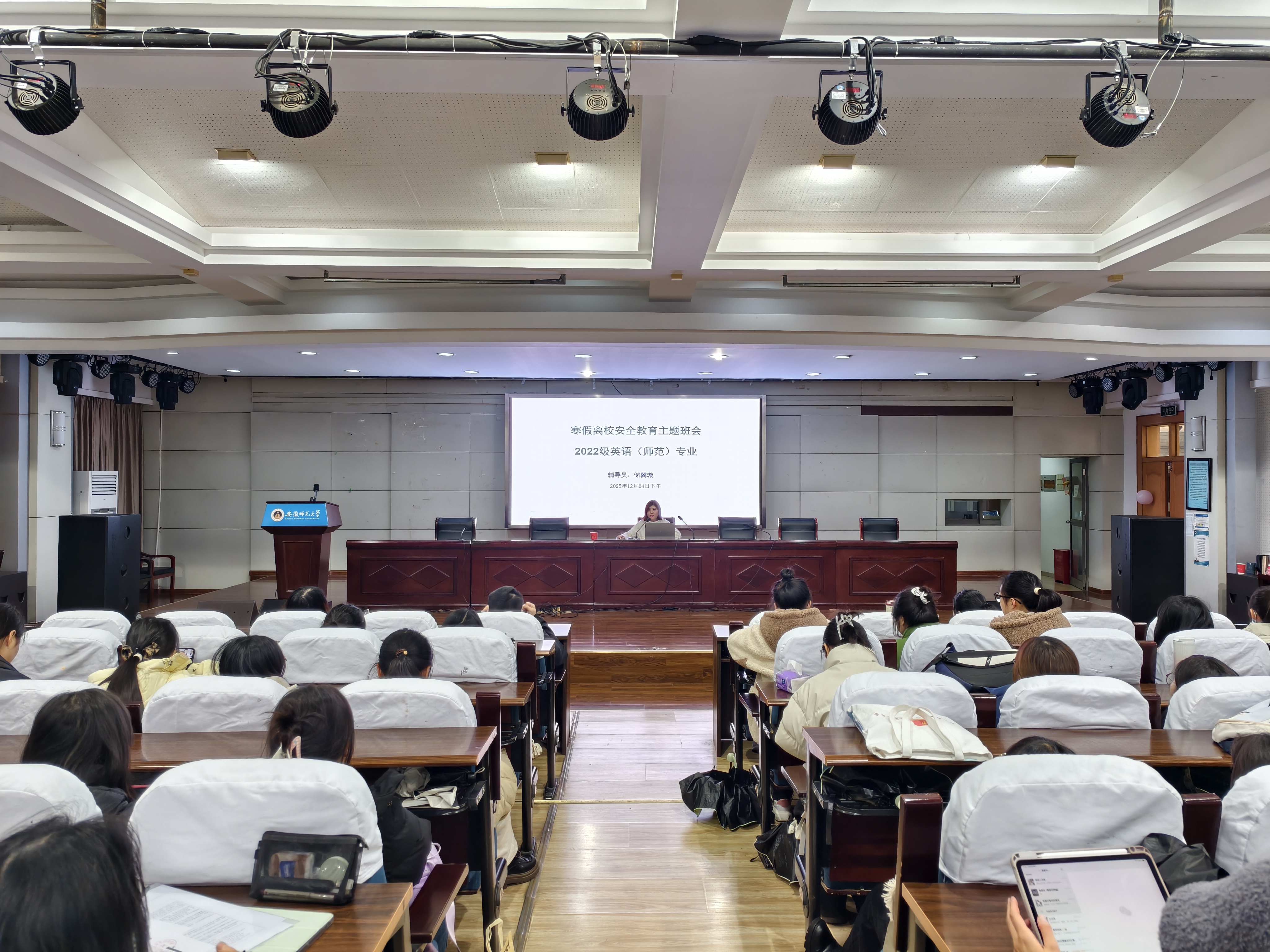 为切实做好期末考试及寒假离校安全管理工作,为大四学生的假期规划与毕业发展指明方向,2025年12月24日下午,2022级本科生诚信教育暨寒假离校安全教育主题班会于学院二楼报告厅召开。本次班会由辅导员储冀璇和朱猛主持,全体2022级学生参与。