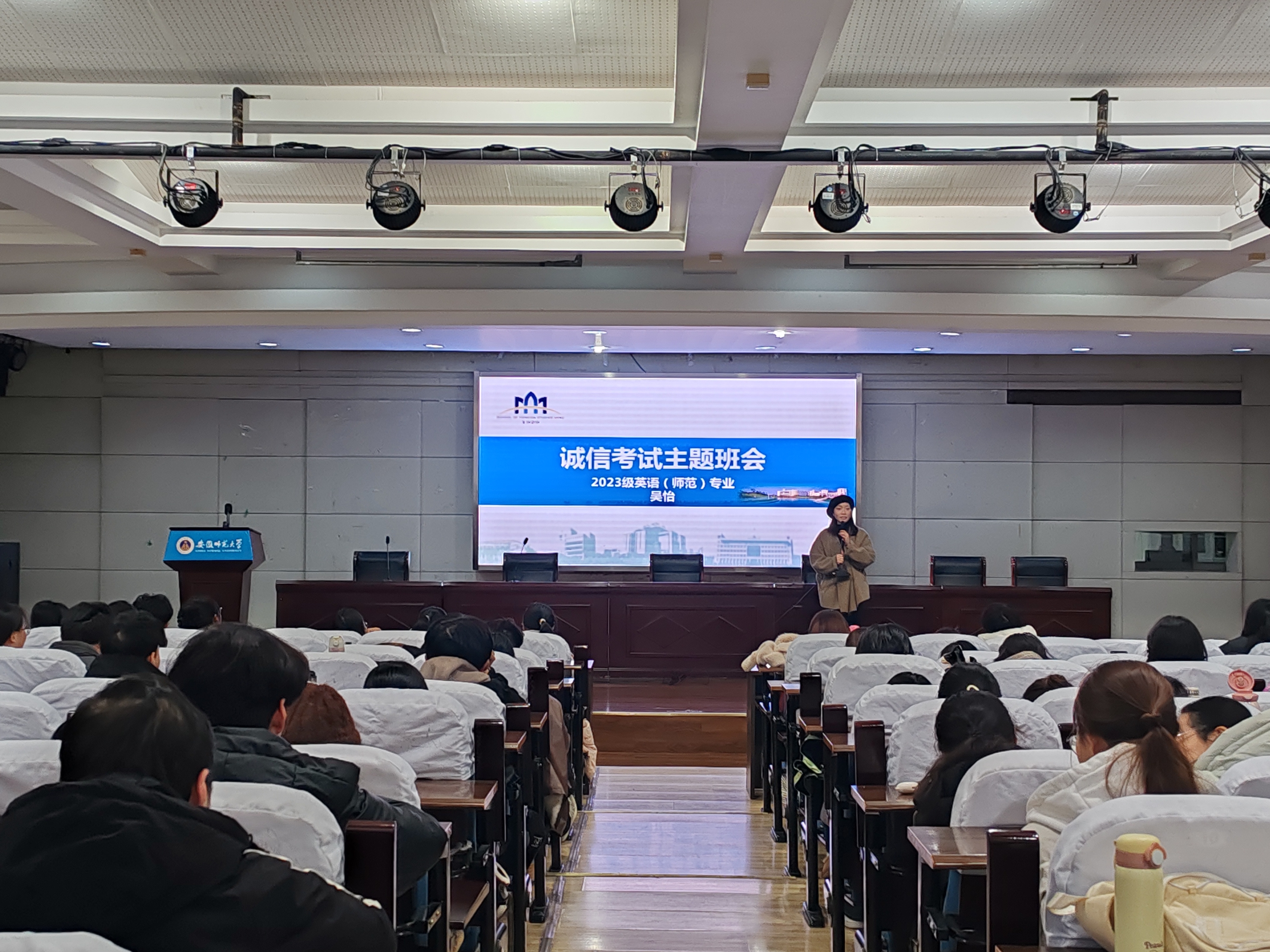 班会现场,辅导员首先聚焦考试诚信教育,结合学校通报的典型违纪案例,向同学们明确违纪作弊的严重后果。随后,辅导员详细解读了《安徽师范大学普通全日制本科生课程考核与成绩管理办法》,强调闭卷考试不得携带电子设备、笔记等违禁物品,考试期间需遵守考场纪律,不得出现旁窥、传接答案等不当行为,并明确了作弊行为对应的处分标准,引导同学们敬畏规则、诚信应考。
