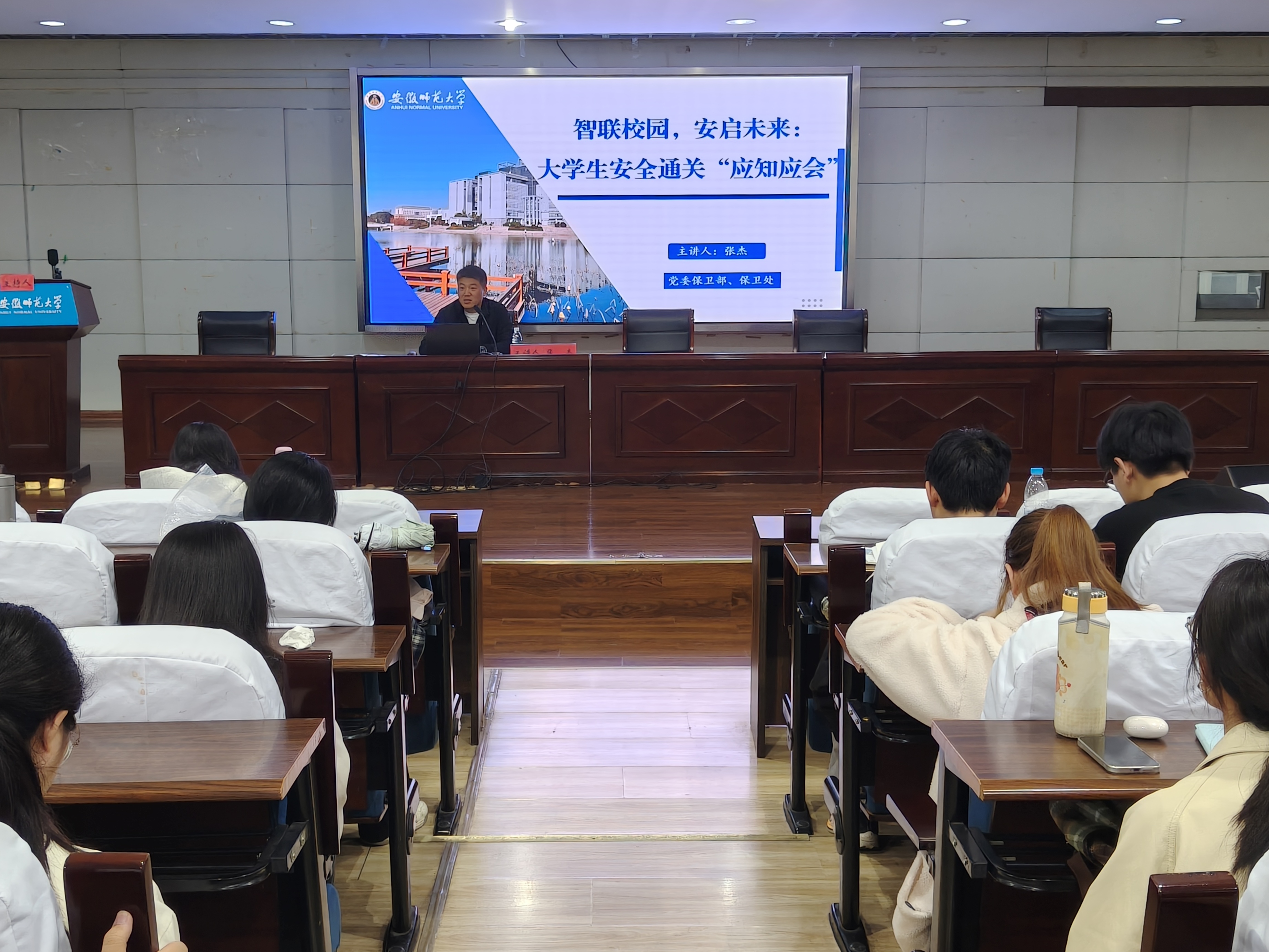 张杰老师以“智联校园,安启未来:大学生安全通关‘应知应会’”为主题,结合校园安全典型案例,从多维度展开系统讲解。针对校园电动车管理,他指出校园电动车存在“多、乱、杂、险”的突出问题,明确规范停放、安全充电等具体要求;围绕宿舍消防安全,他着重强调严禁使用热得快、电炉、电热毯等违规电器,严禁在宿舍内吸烟、使用明火,严禁私拉乱接电线、将电源线和插座放置在床铺上,同时提醒同学们杜绝充电宝过夜充电等行为;针对当前电信网络诈骗高发态势,张老师细致讲解了电信诈骗“手段日新月异、团伙藏匿境外且集团化运作、破案追赃难度大、具备可防性”四大特点,并结合“防电信诈骗十守则”,重点提醒同学们不点击陌生短信链接、不向他人泄露短信验证码、不接听无显示号码来电,结合真实案例详细讲解反诈技巧,引导同学们提高反诈意识,守护好个人财产安全。
