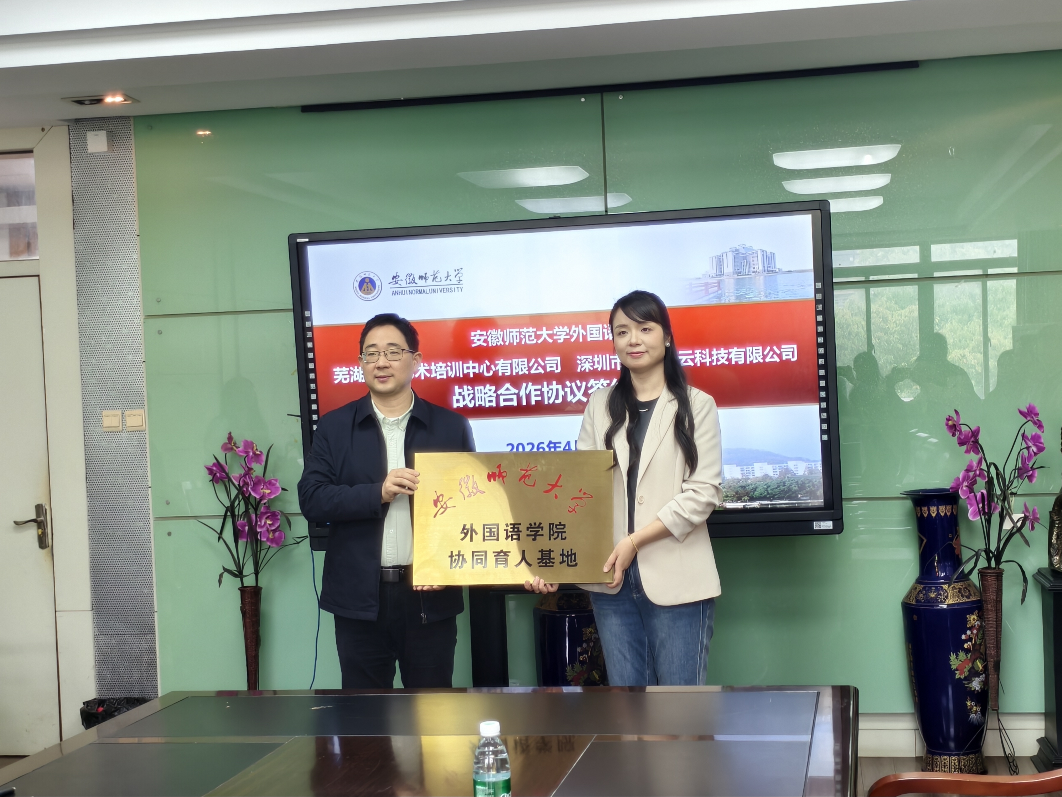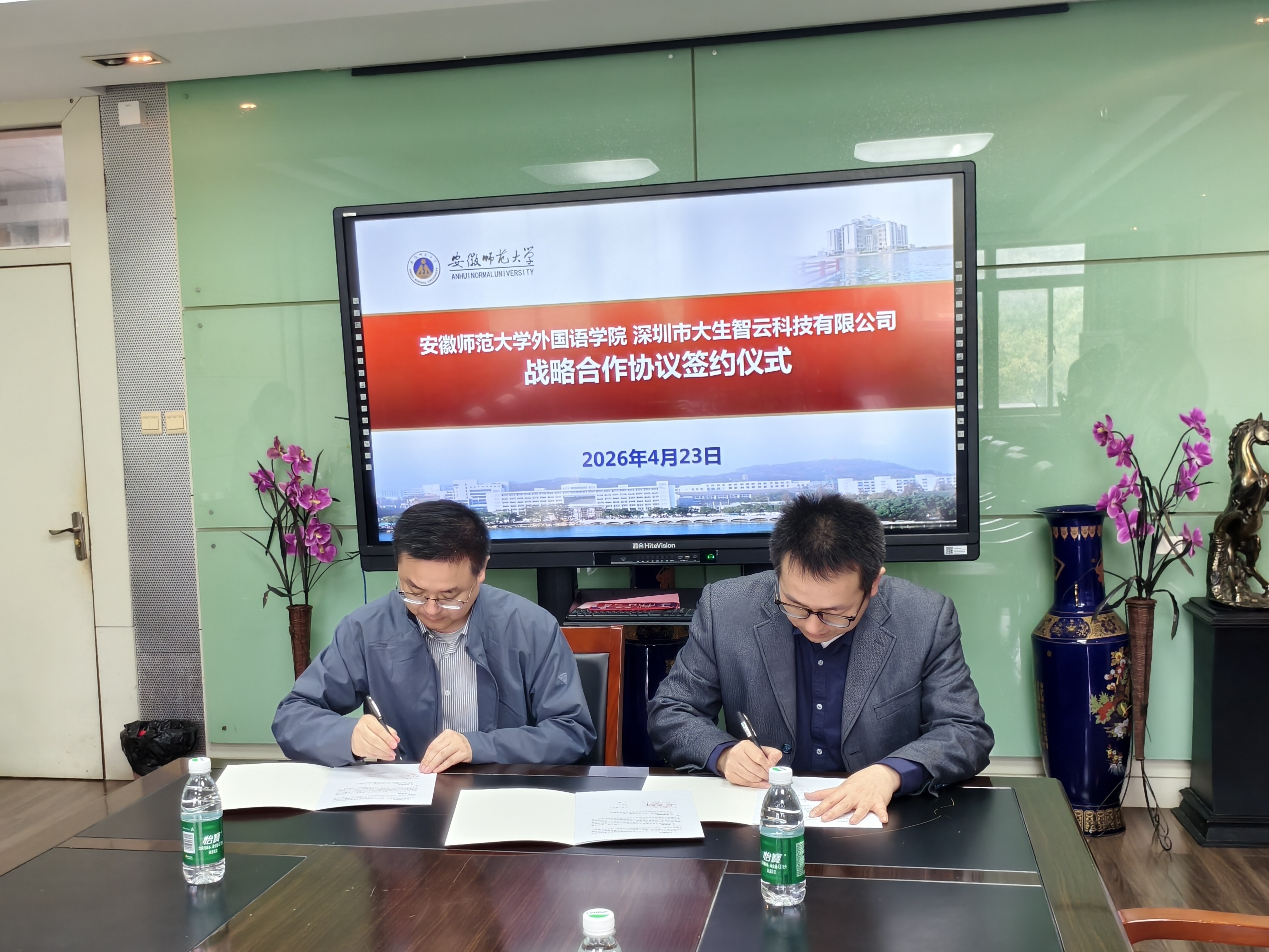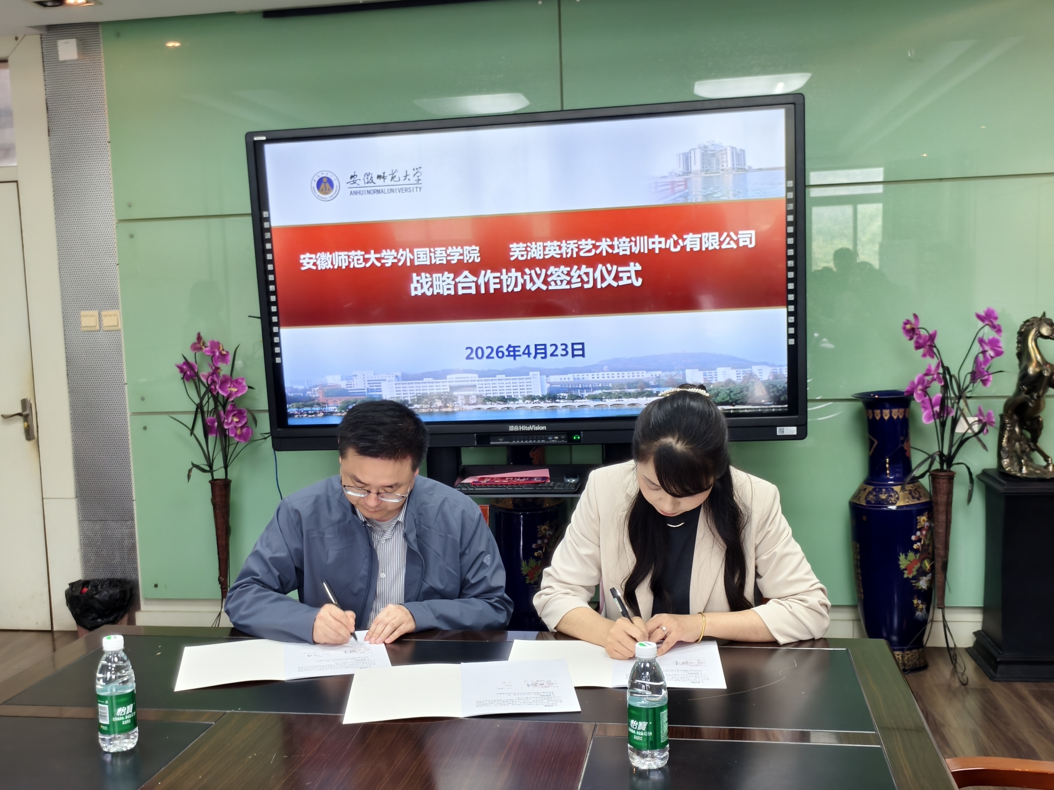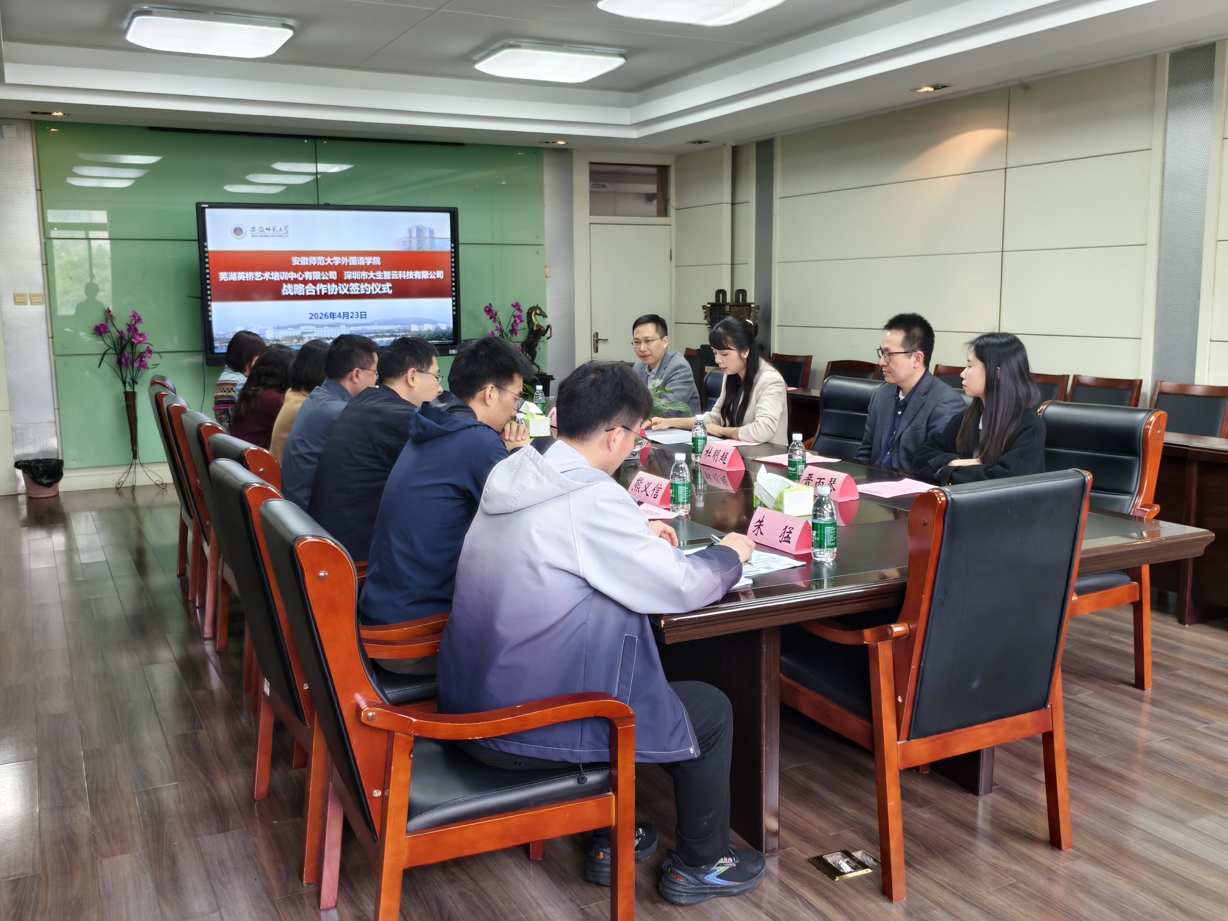 2026年4月23日下午,安徽师范大学外国语学院与芜湖英桥艺术培训中心有限公司、深圳市大生智云科技有限公司签订合作共建协议。院长张孝荣,副院长许炳坤、蔡静,芜湖英桥艺术培训中心有限公司校长许靖、总经理袁近、副校长晋雨琴,深圳市大生智云科技有限公司合肥基地负责人杜明超等出席签约仪式,共同见证校企合作新起点。签约仪式由院党委副书记章姗姗主持。