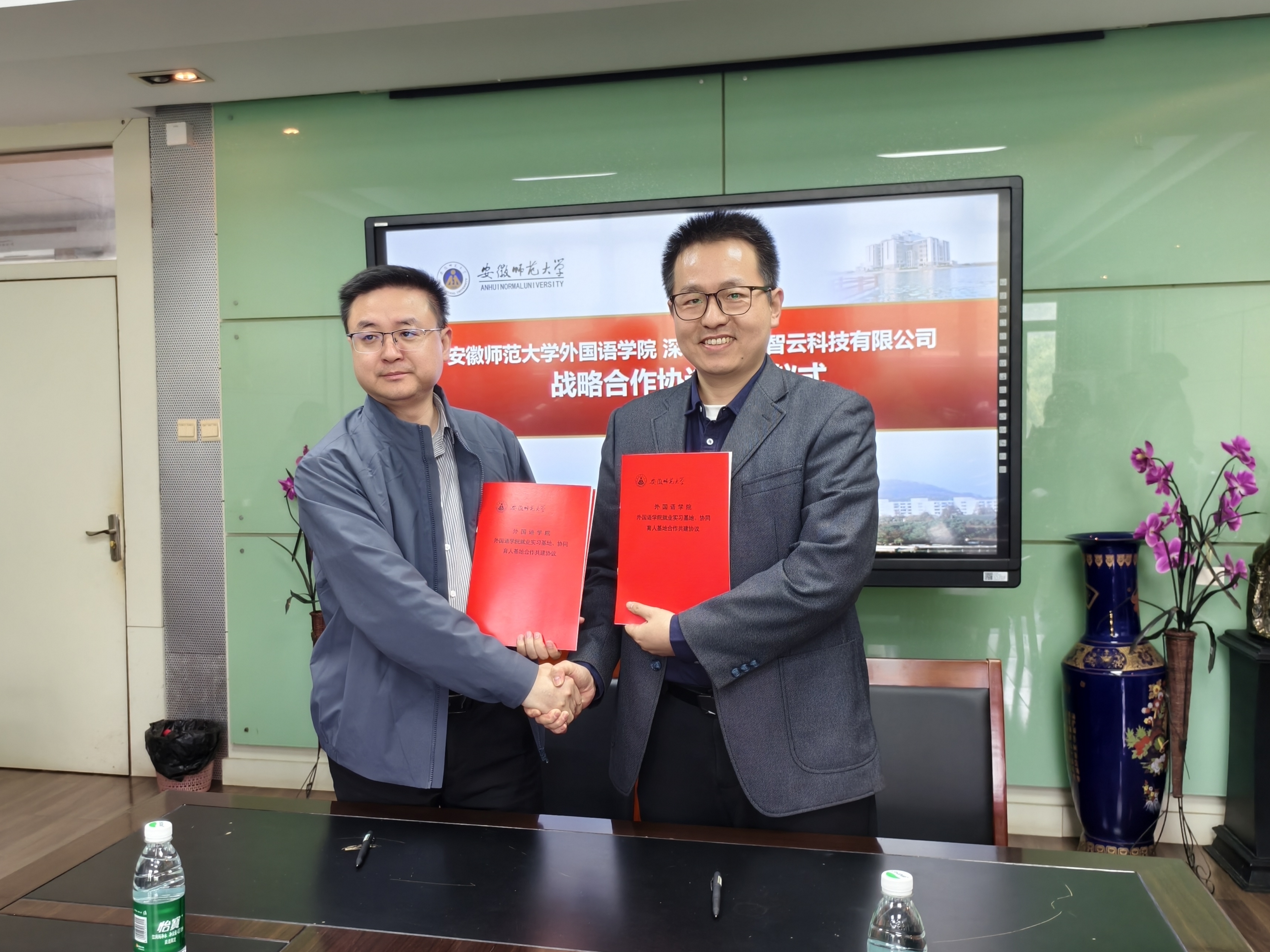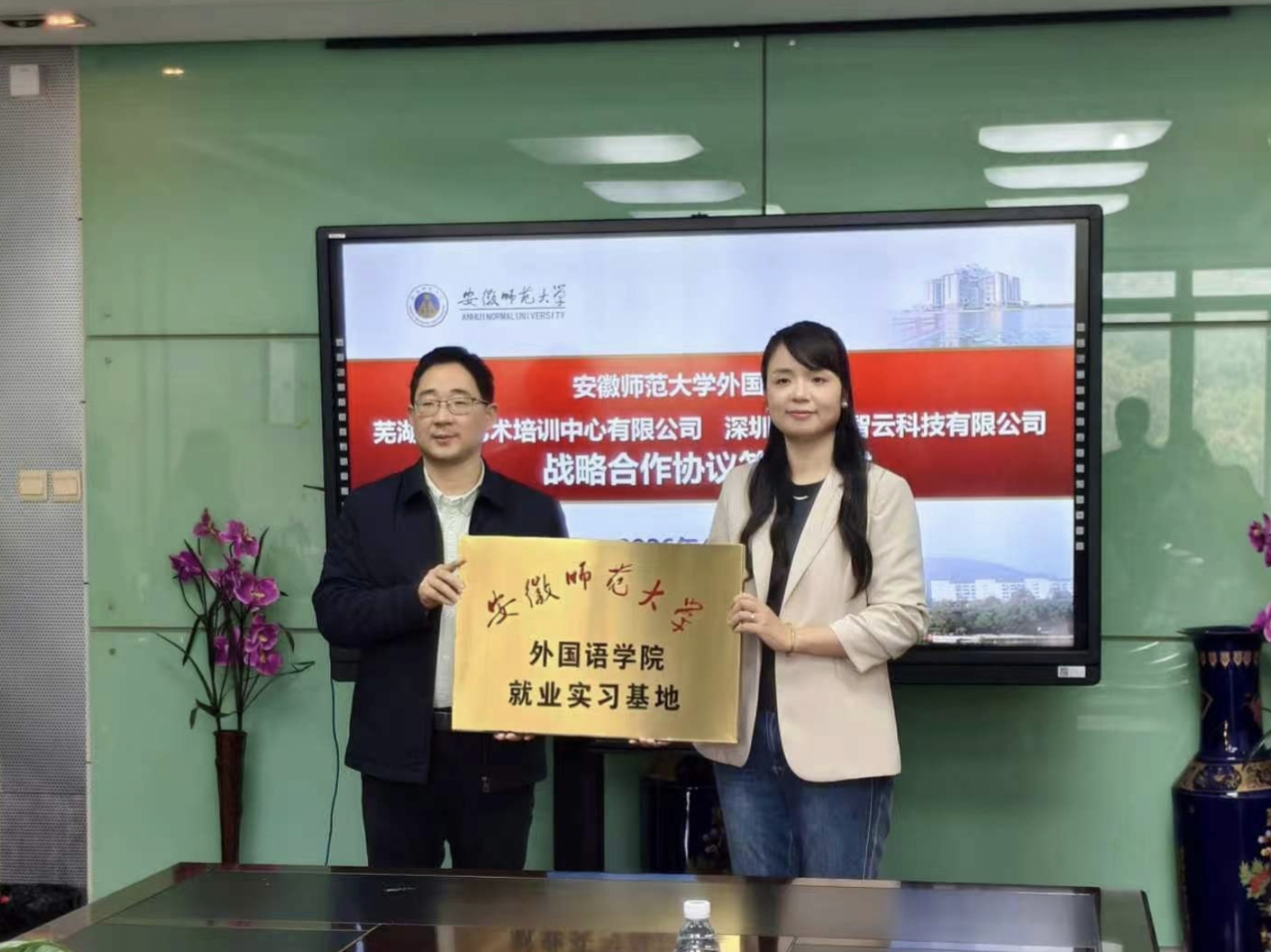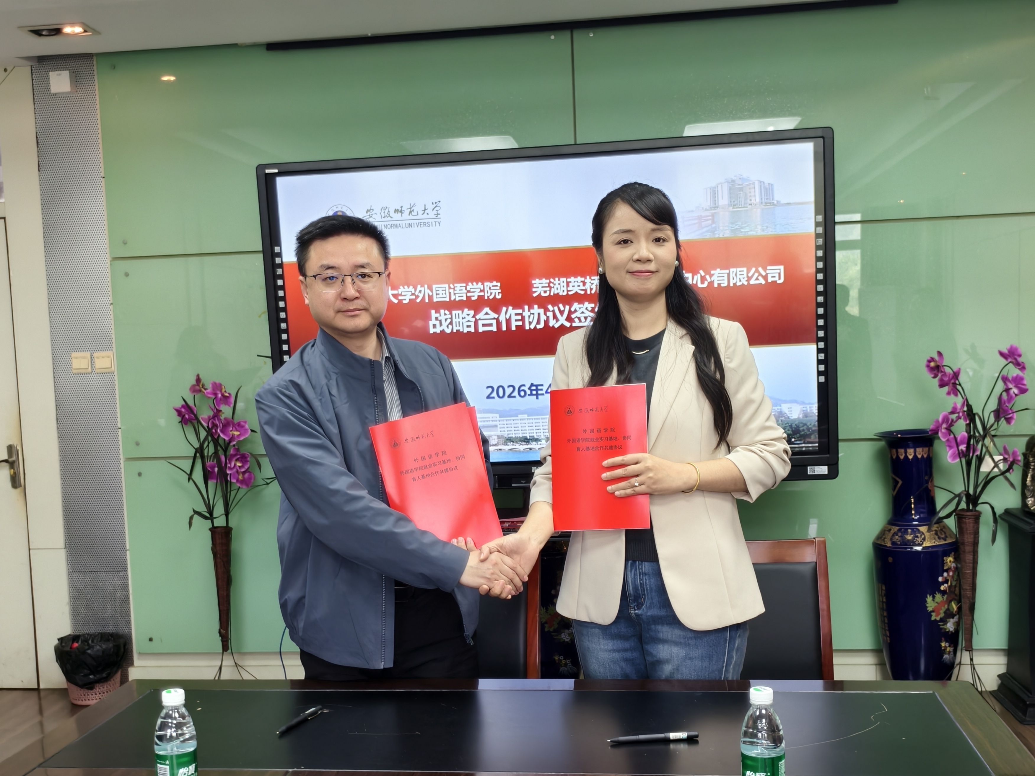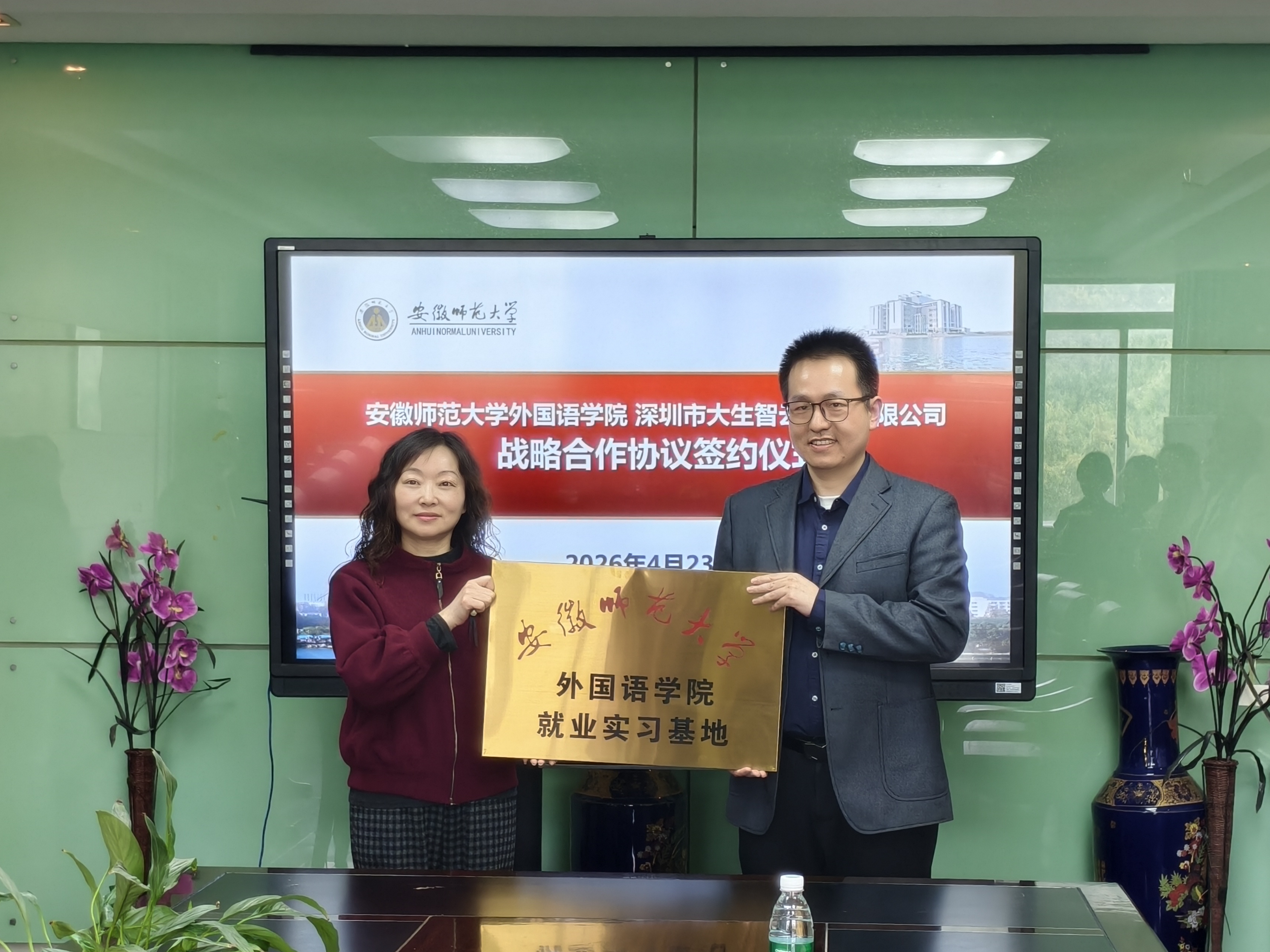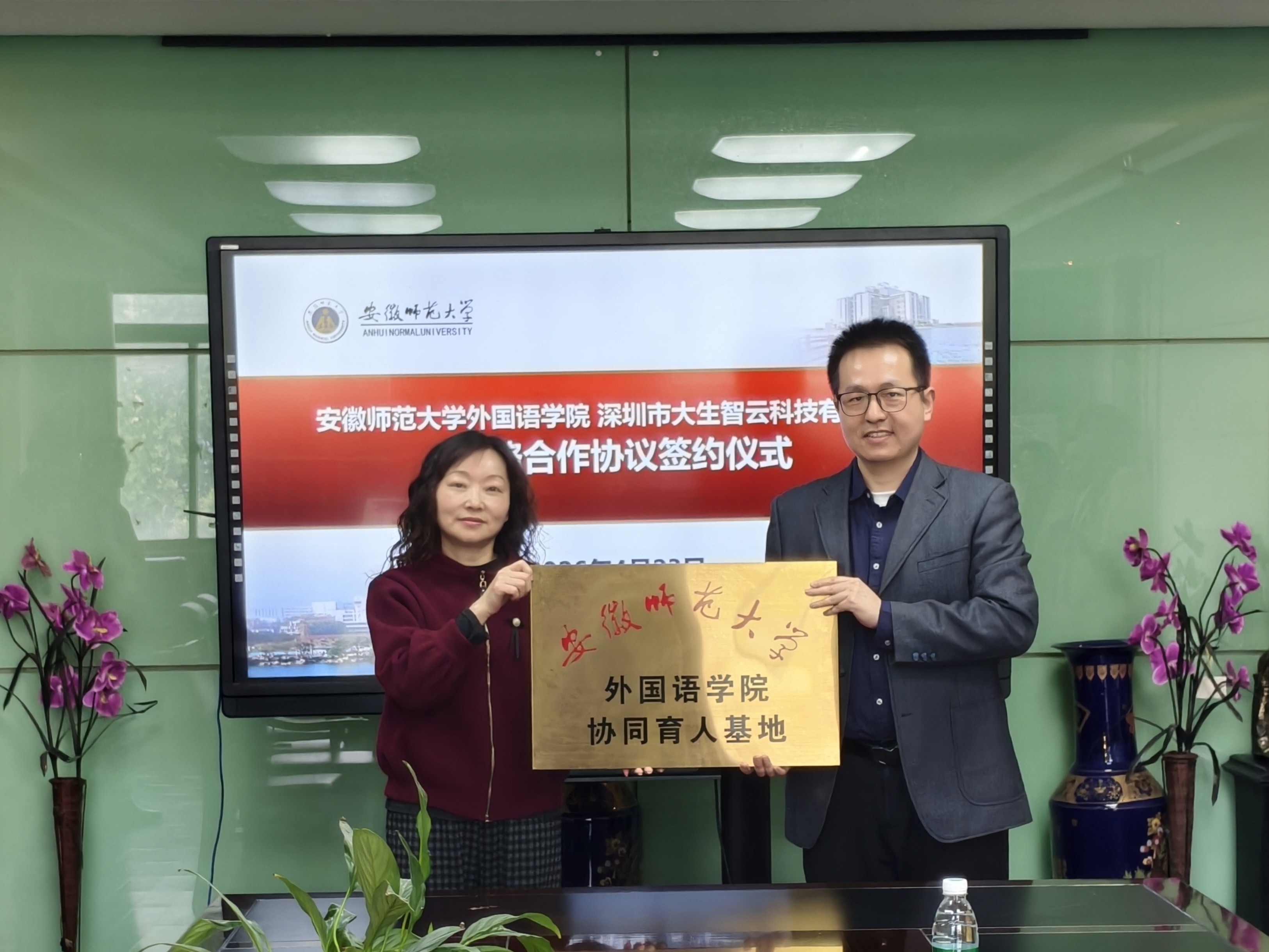 2026年4月23日下午,安徽师范大学外国语学院与芜湖英桥艺术培训中心有限公司、深圳市大生智云科技有限公司签订合作共建协议。院长张孝荣,副院长许炳坤、蔡静,芜湖英桥艺术培训中心有限公司校长许靖、总经理袁近、副校长晋雨琴,深圳市大生智云科技有限公司合肥基地负责人杜明超等出席签约仪式,共同见证校企合作新起点。签约仪式由院党委副书记章姗姗主持。