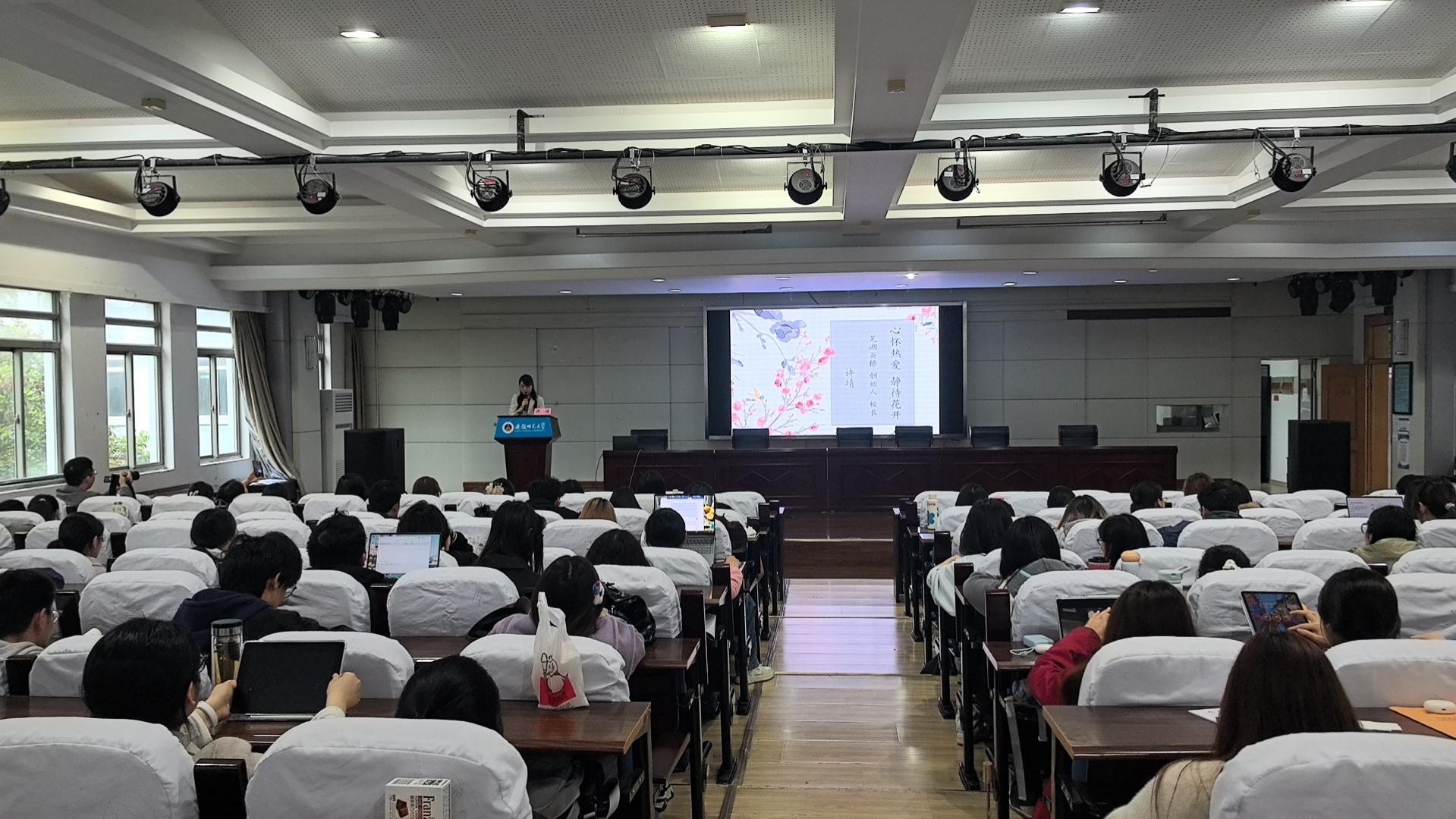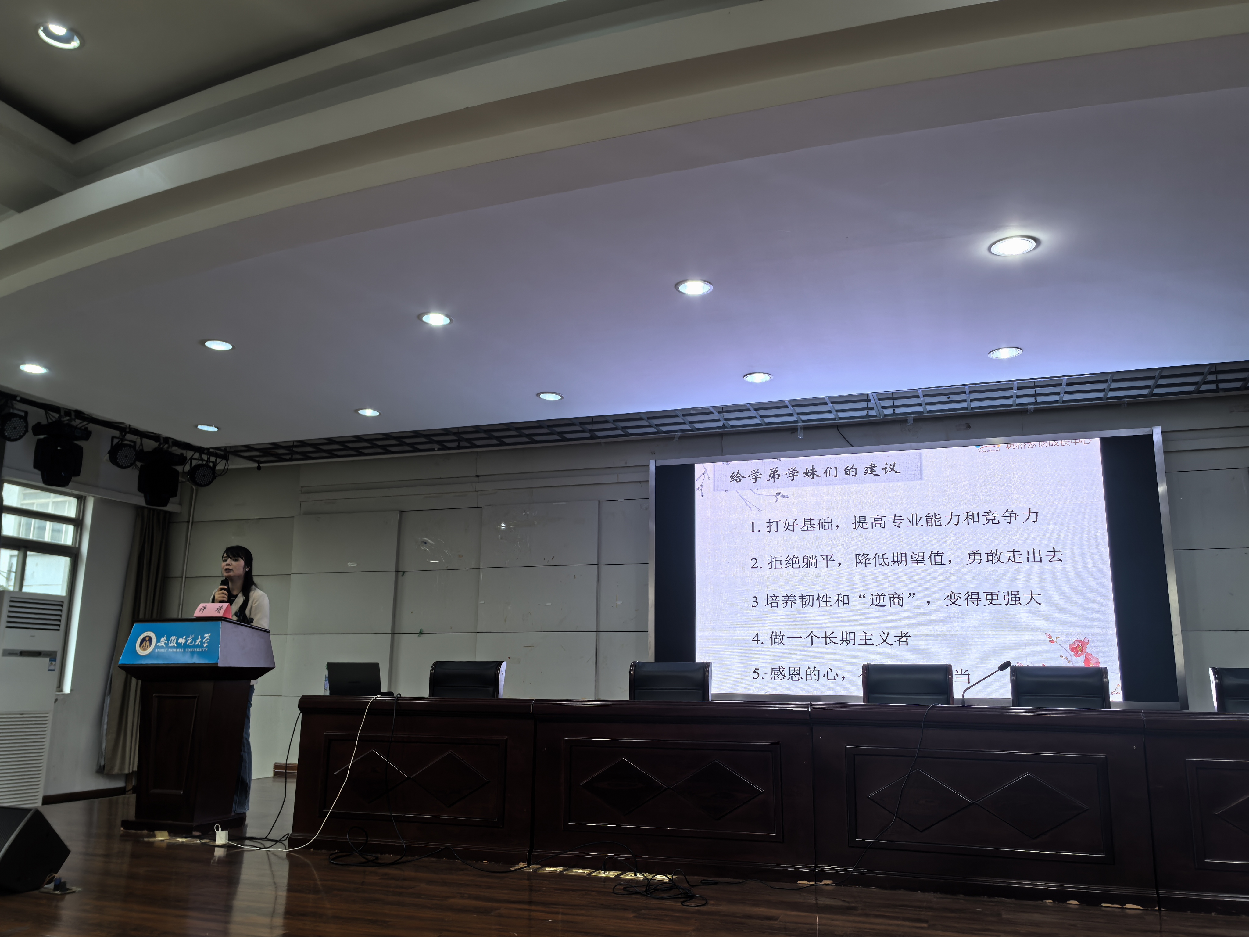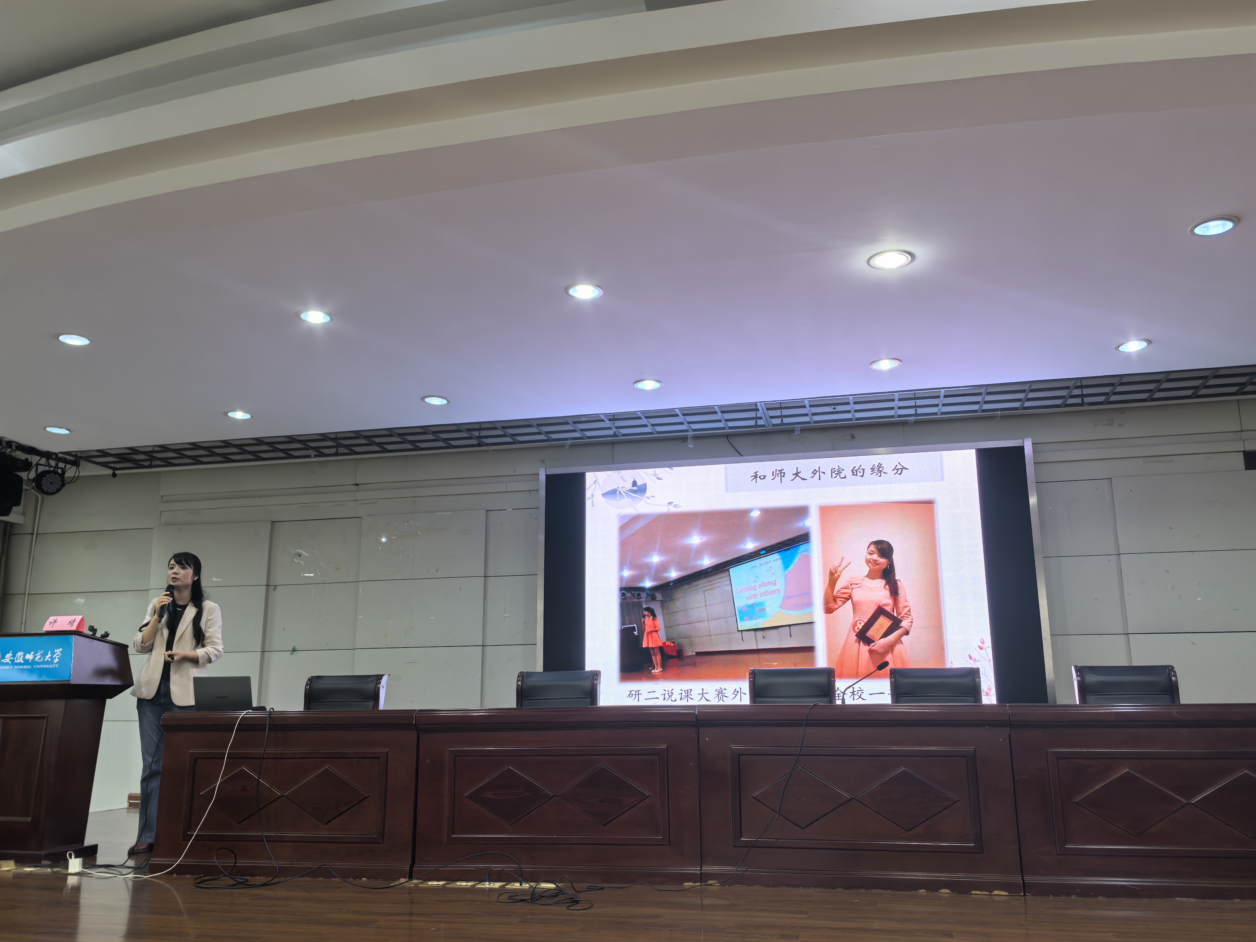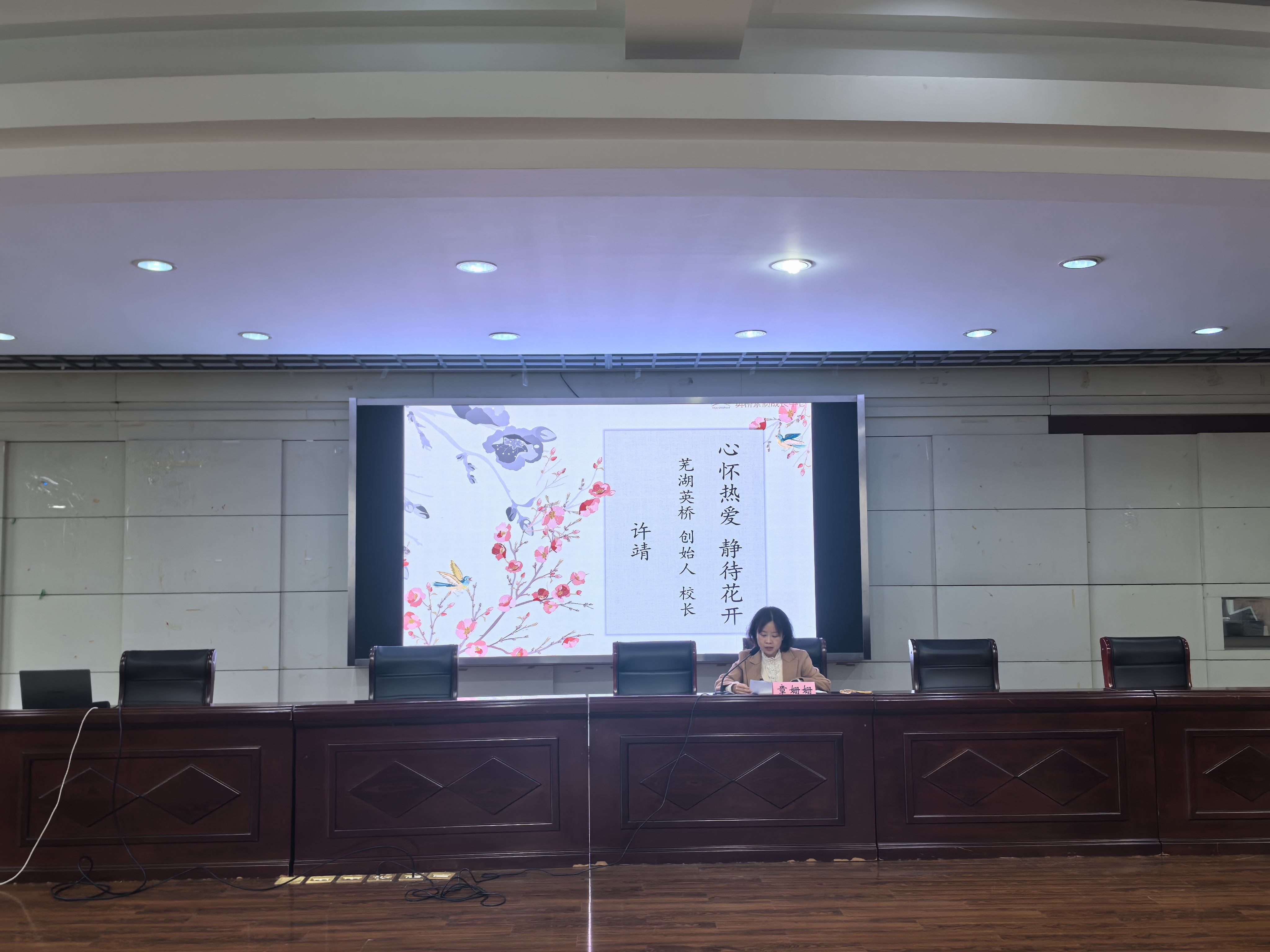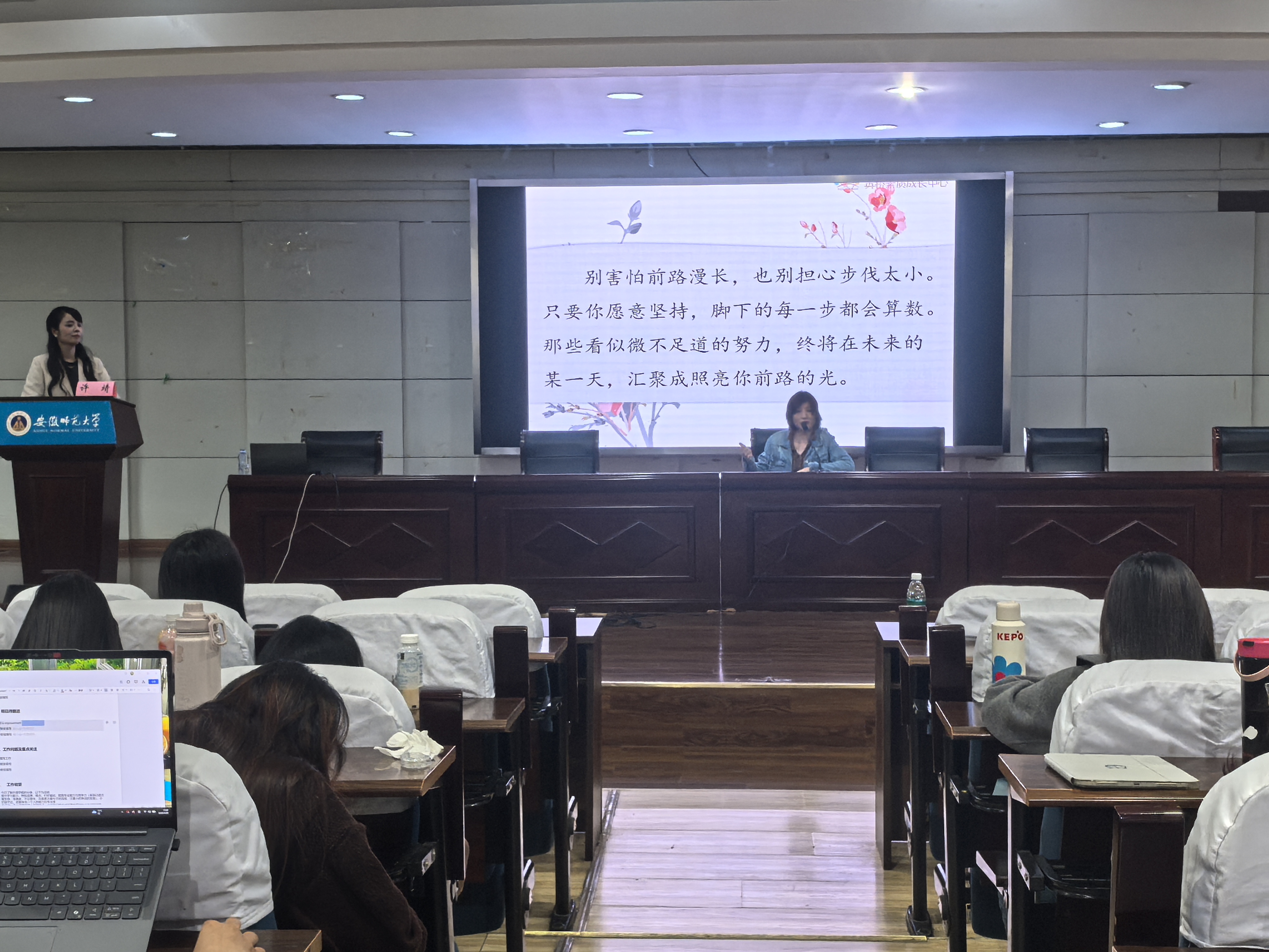 章姗姗对许靖校长的到来表示热烈欢迎。她指出,许靖校长作为外国语学院的优秀校友,从化学跨专业考研至英语专业,凭借对教育的赤诚与坚守,成功创办了芜湖英桥艺术培训中心(现为芜湖英桥艺术培训中心有限公司),是“心怀热爱、静待花开”的生动践行者。她希望同学们能从学姐的成长轨迹中汲取力量,在自己的人生赛道上,跑出属于自己的精彩与辉煌。